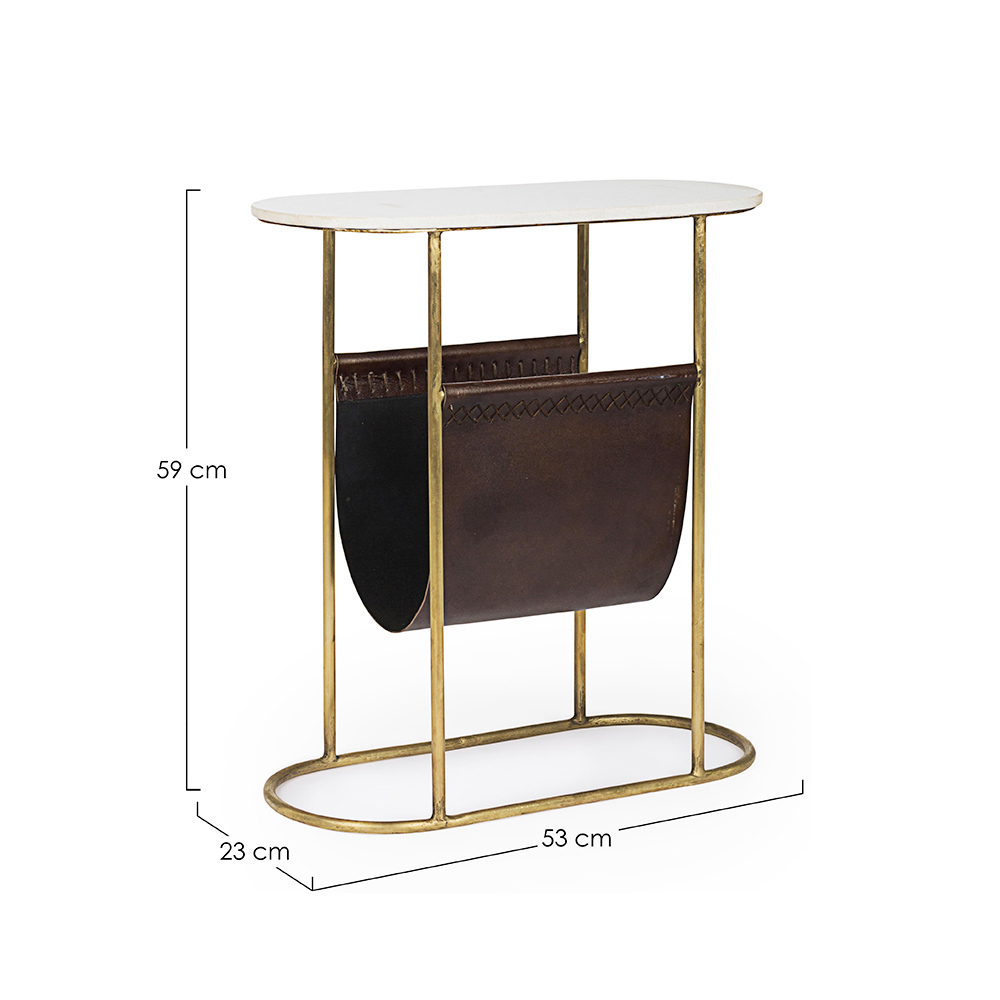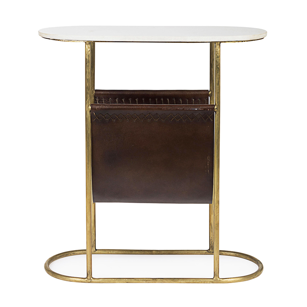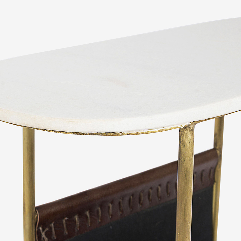 Table basse en acier laitonné et plateau en marbre avec porte-revues en cuir.