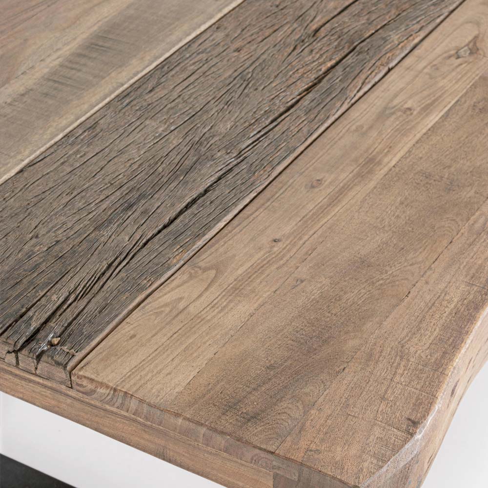 Le design industriel minimal est caractérisé par l'insert central en bois recyclé avec une finition acrylique protectrice.