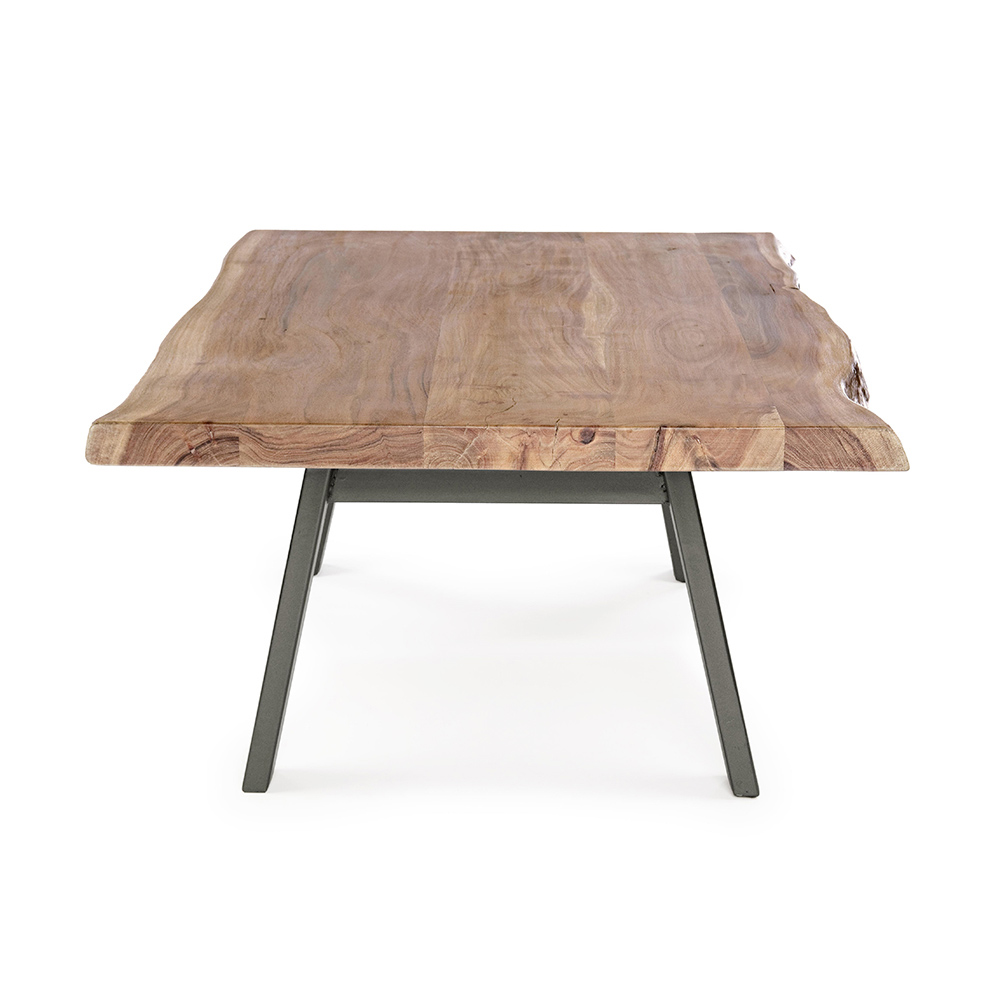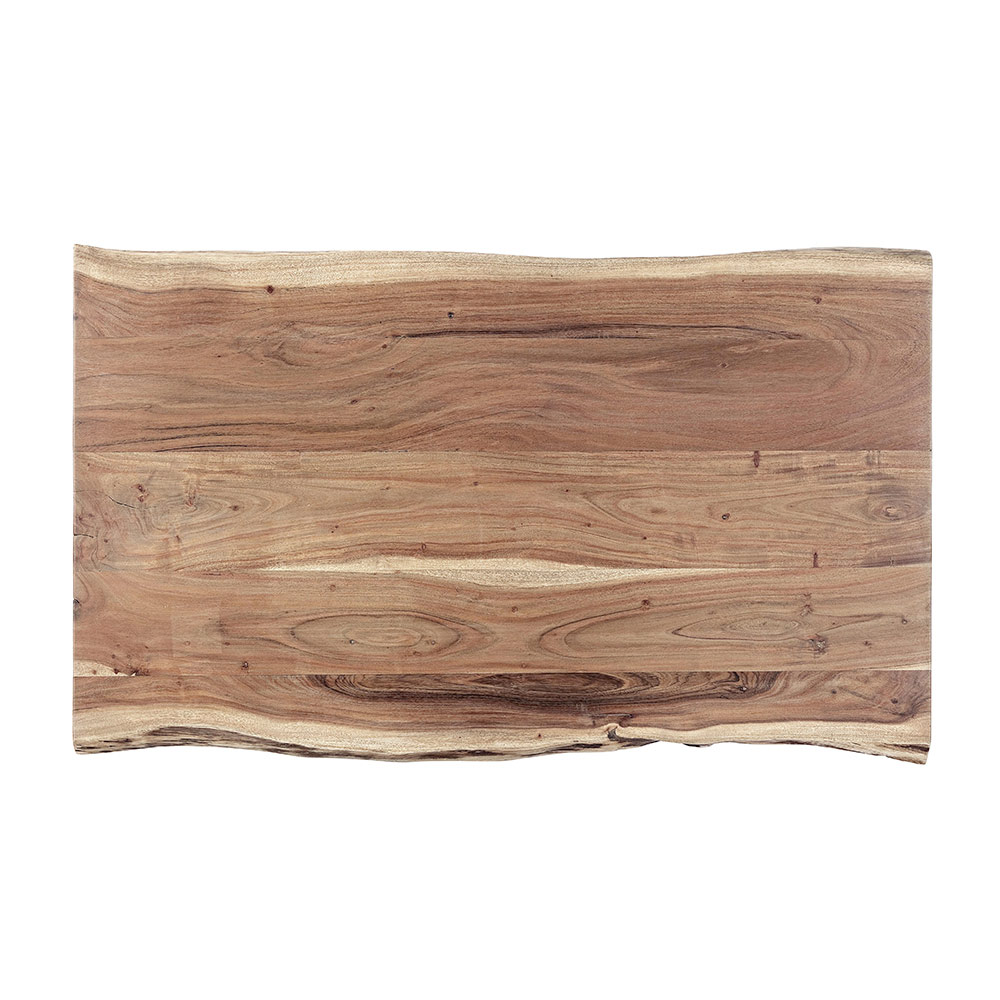 Sa véritable particularité est donnée par le plateau en bois d'acacia aux chants irréguliers (effet bois vivant) réalisé à la main avec une finition à base de vernis polyuréthane.