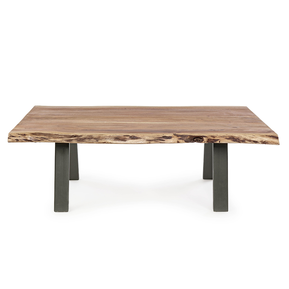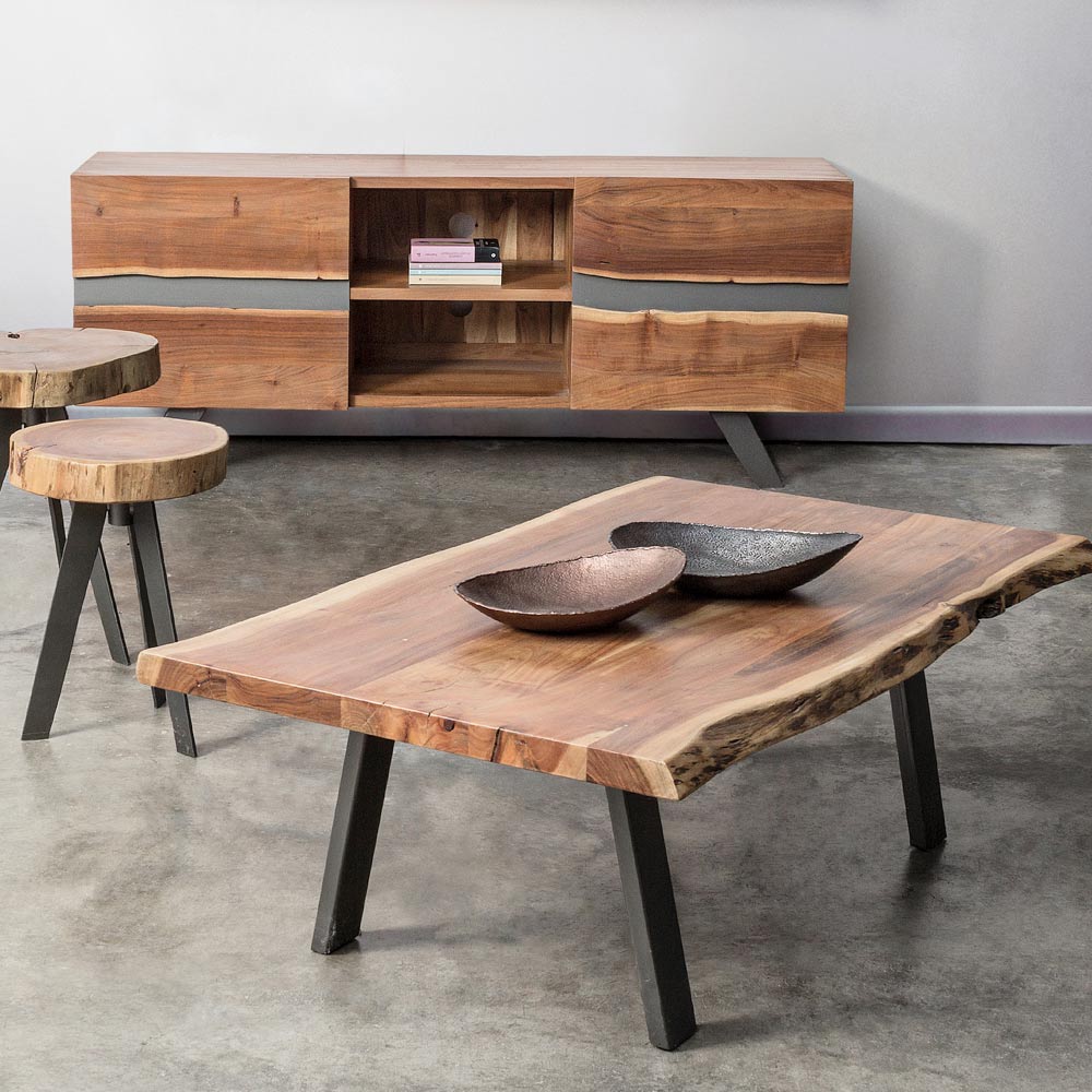 Table basse en bois d'acacia artisanal et pieds en acier.