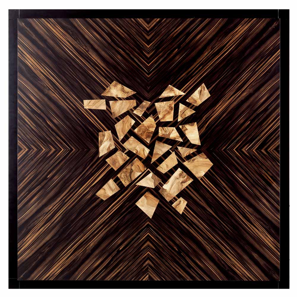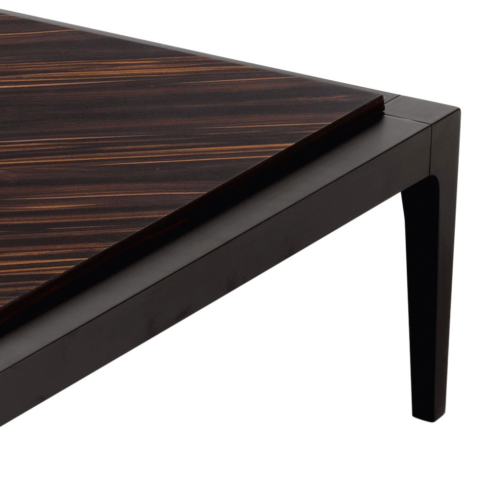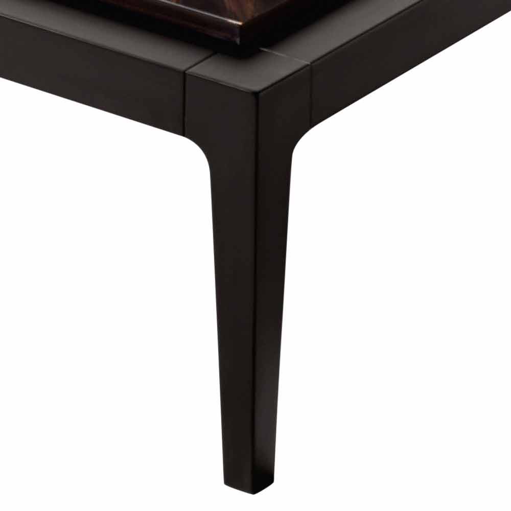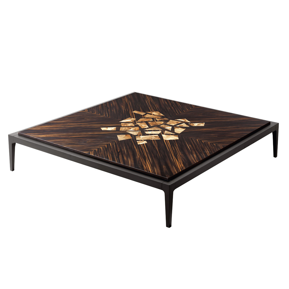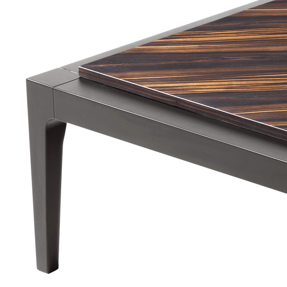 Table design en bois massif fabriquée en Italie Grilli Zarafa La table basse carrée Zarafa a une structure en tilleul massif, un plateau en placage avec placage en ébène et des inserts en coriandre en bois de noyer. La finition supérieure est lucide et la base est noir mat.
