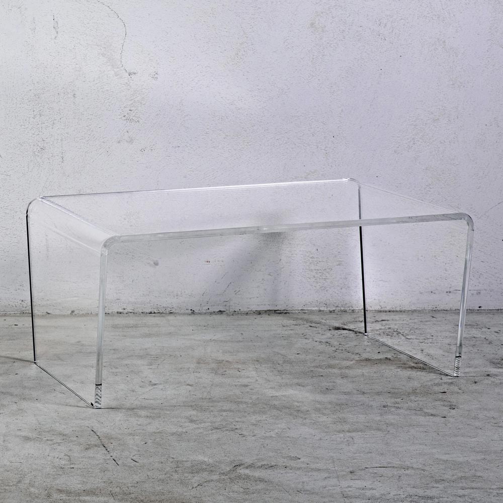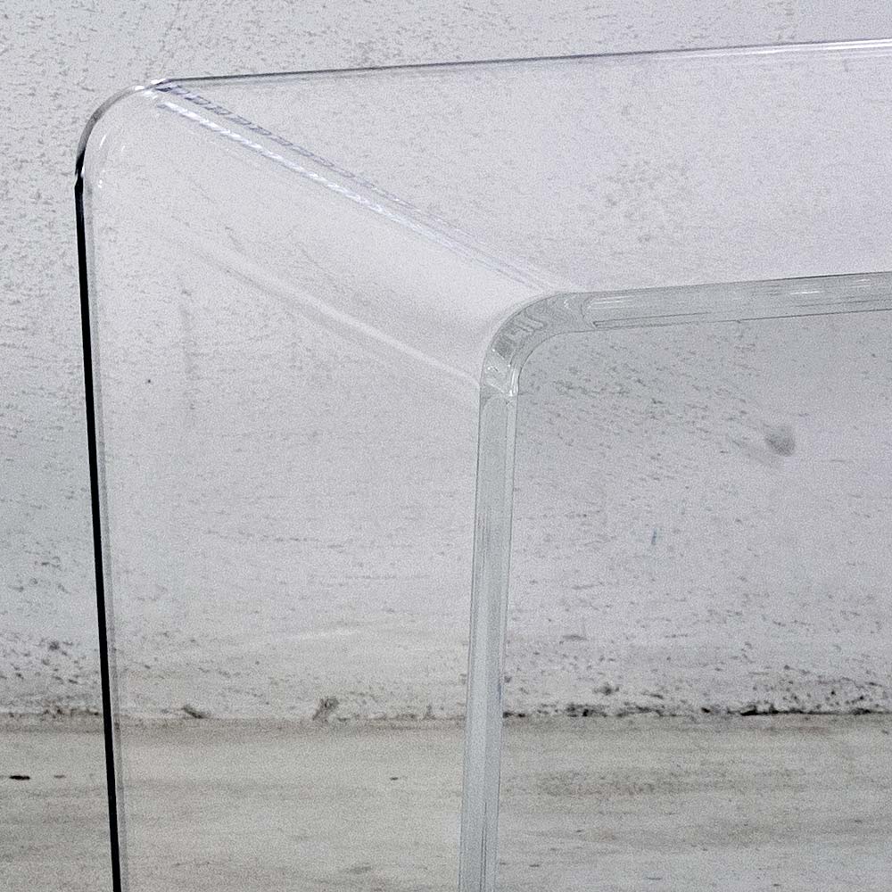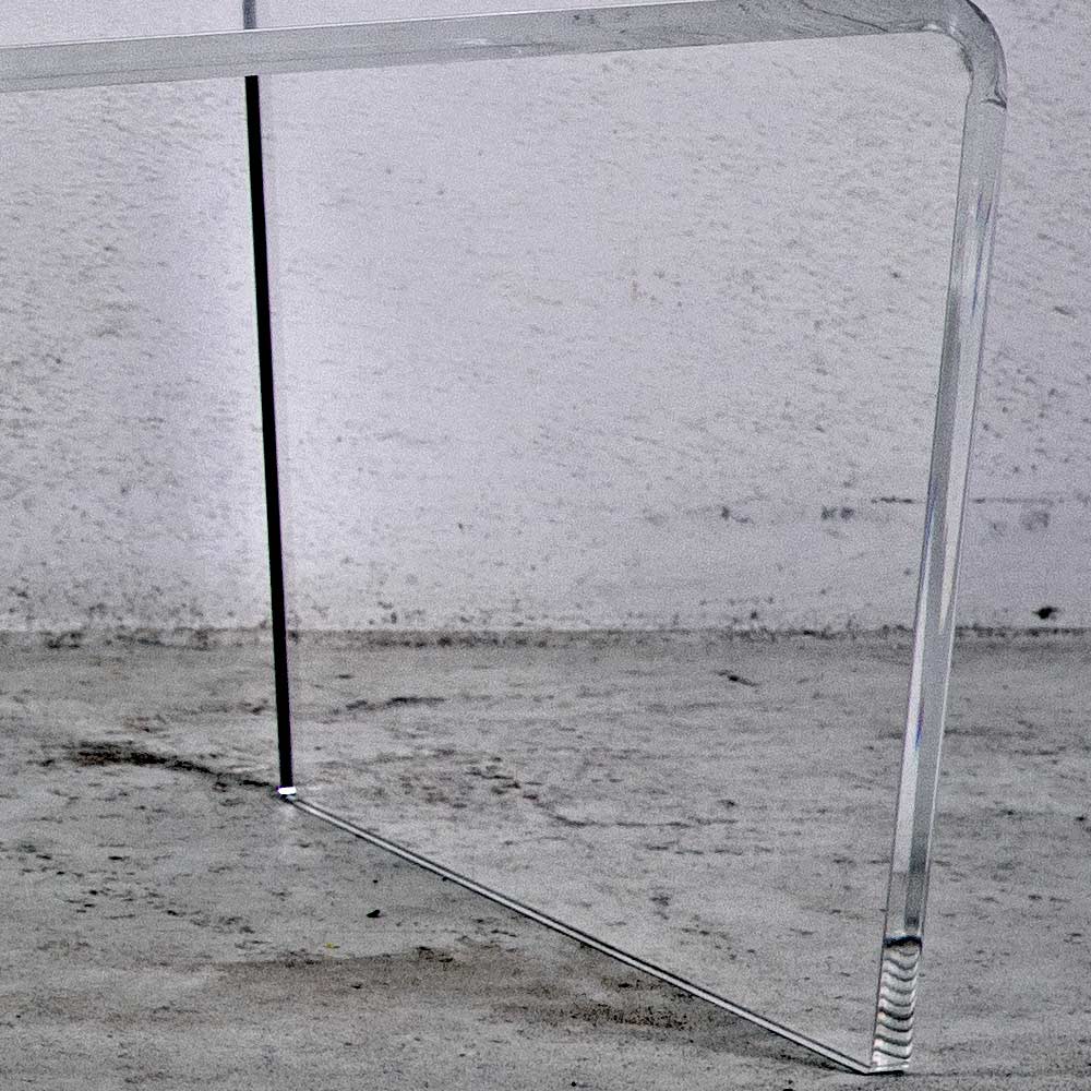 Table basse rectangulaire en cristal acrylique transparent plié à la main fabriqué en Italie.