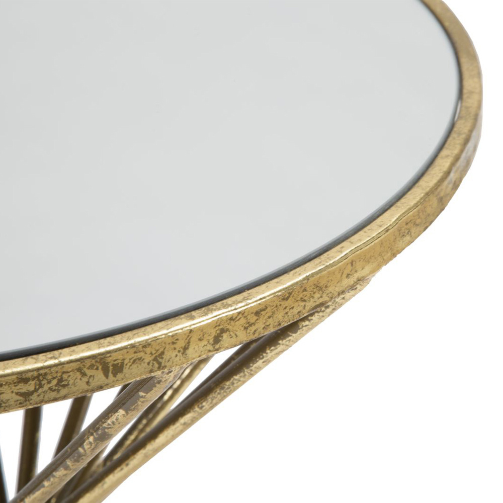 Table basse en fer doré avec plateau miroir rond.