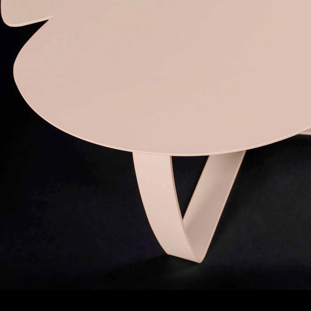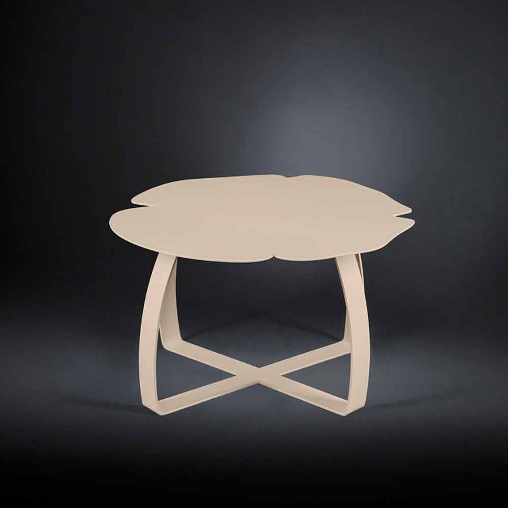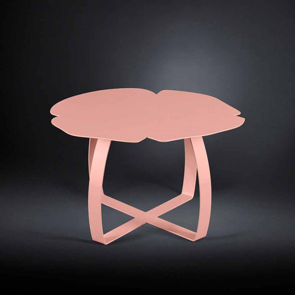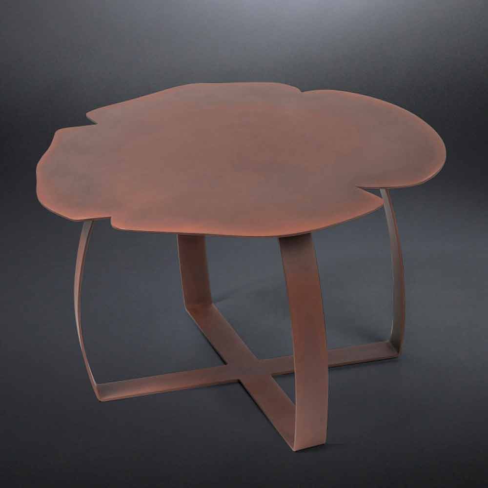 Table basse avec plateau en forme de fleur en métal découpé. Les pieds de la table, en métal courbé, sont peint dans la même couleur du plateau, sauf pour la version avec finition camouflage. Peinture époxy disponible en plusieur coloris.