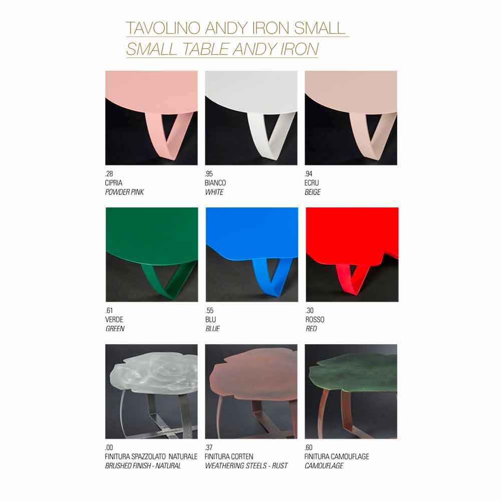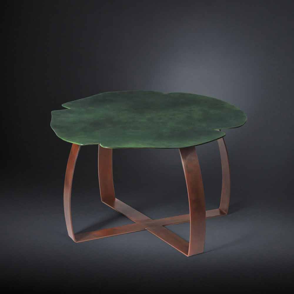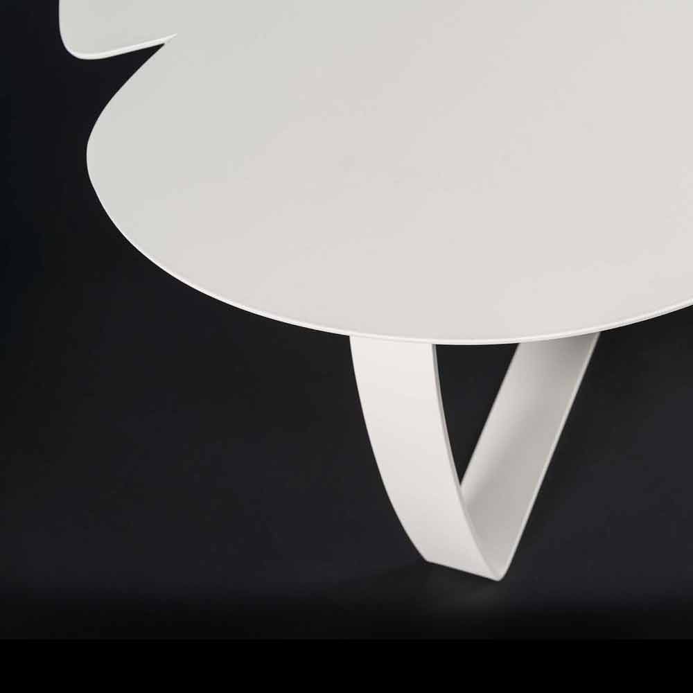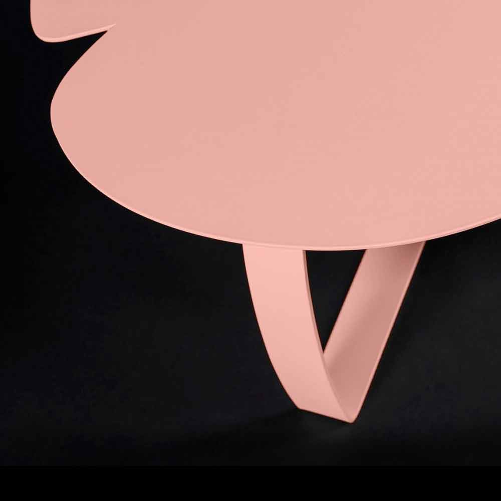 Table basse avec plateau en forme de fleur en métal découpé. Les pieds de la table, en métal courbé, sont peint dans la même couleur du plateau, sauf pour la version avec finition camouflage. Peinture époxy disponible en plusieur coloris.