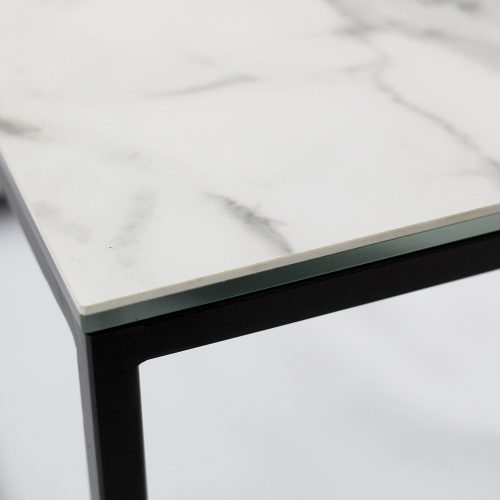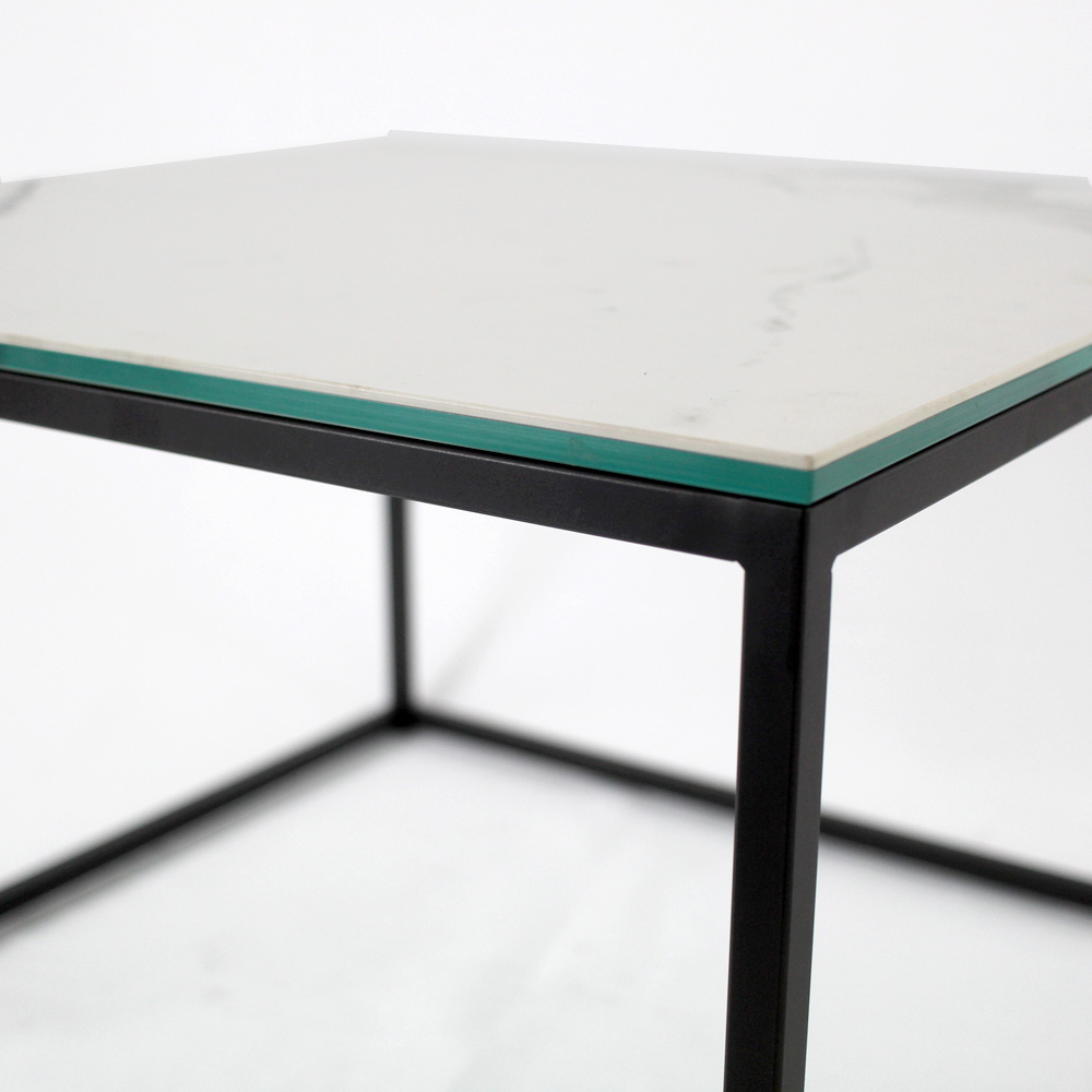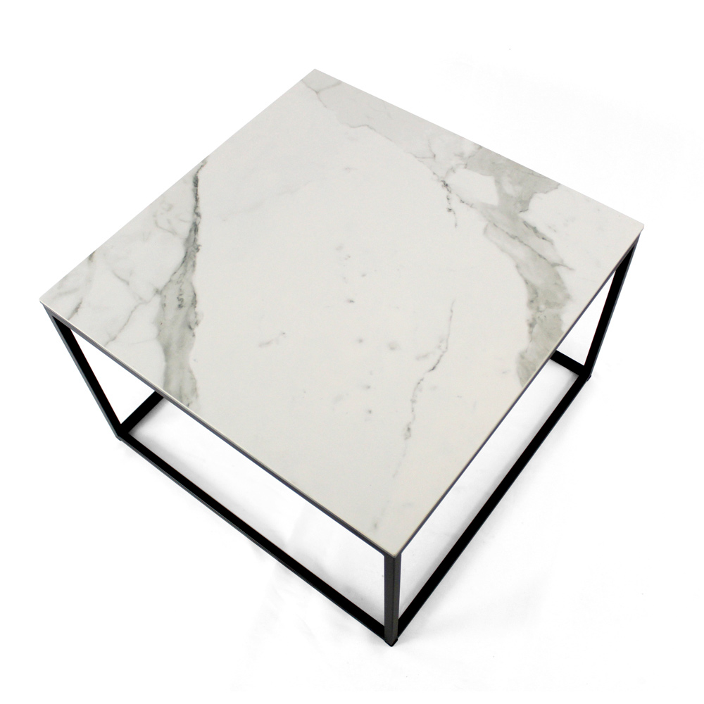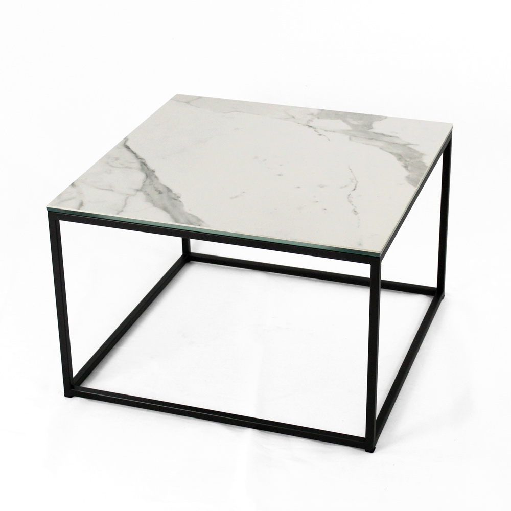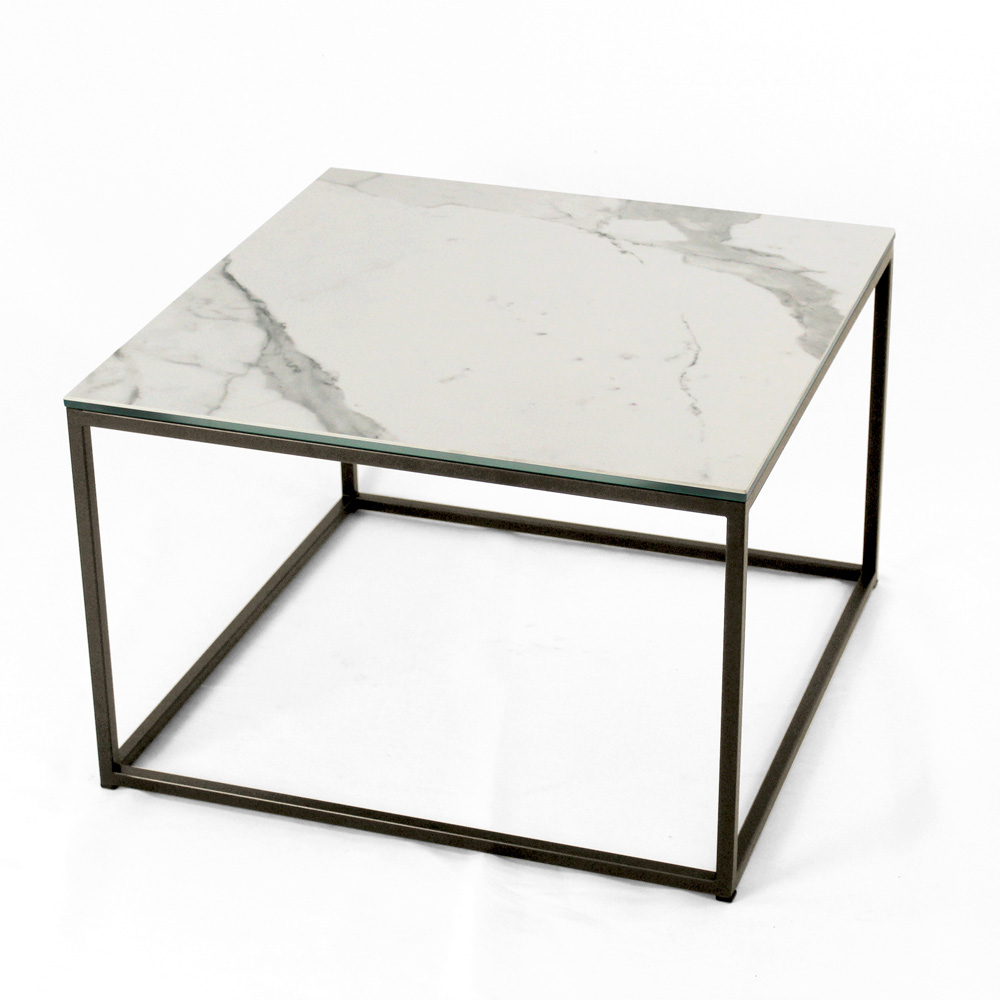 Table basse carrée avec base en acier peint et plateau en grès blanc statuaire veiné mat de 3 mm laminé de verre flotté de 6 mm. Les tables basses de style moderne représentent le meuble parfait pour compléter la décoration de n'importe quel salon et salle de séjour. Ces produits sont uniques, élégants et fonctionnels à la fois grâce à leurs finitions simples et harmonieuses qui les rendent adaptés à tous les besoins et occasions d'utilisation. Les matériaux utilisés pour la construction garantissent une grande qualité et résistance même au fil du temps.