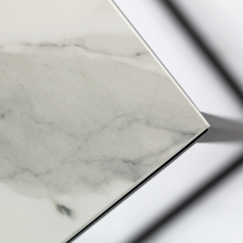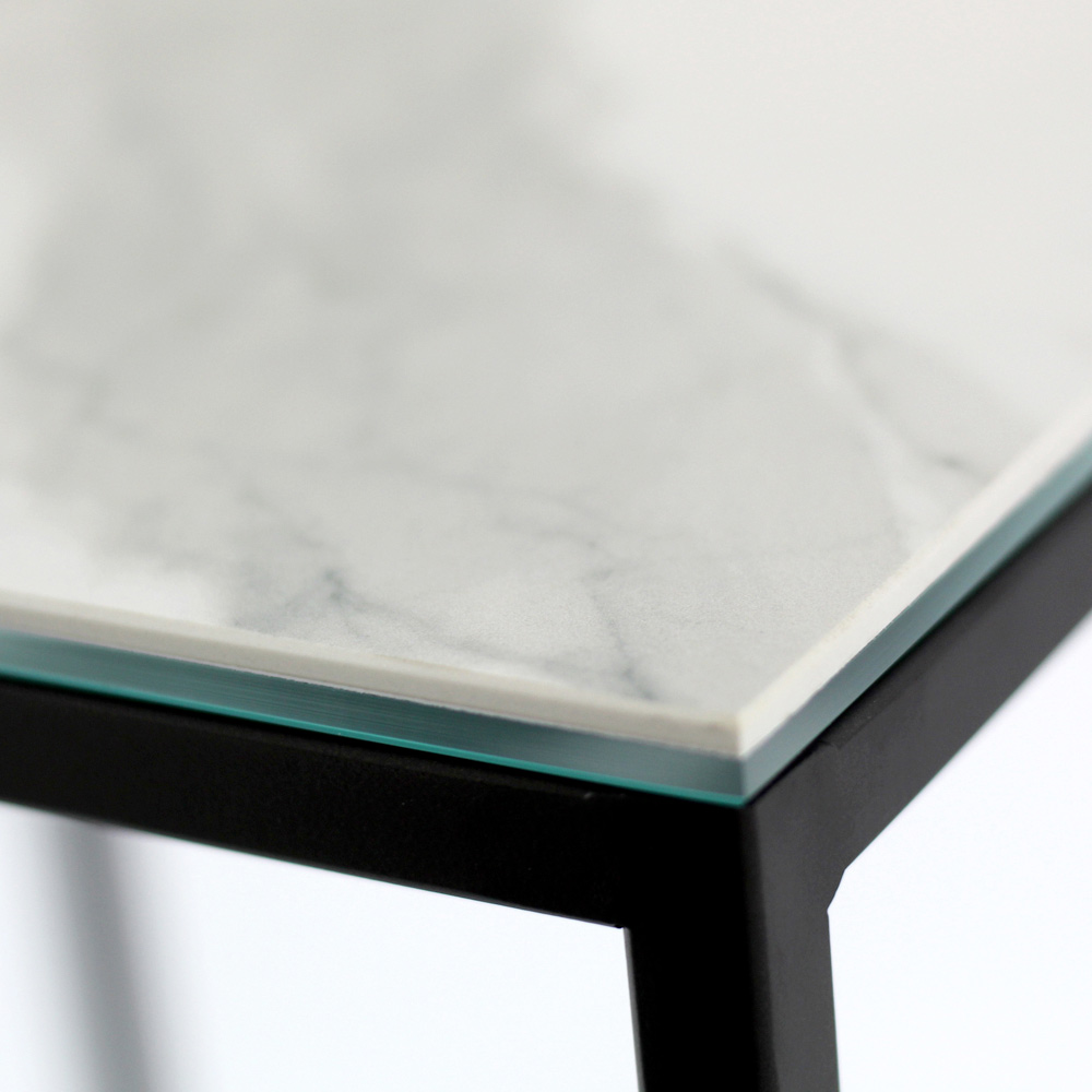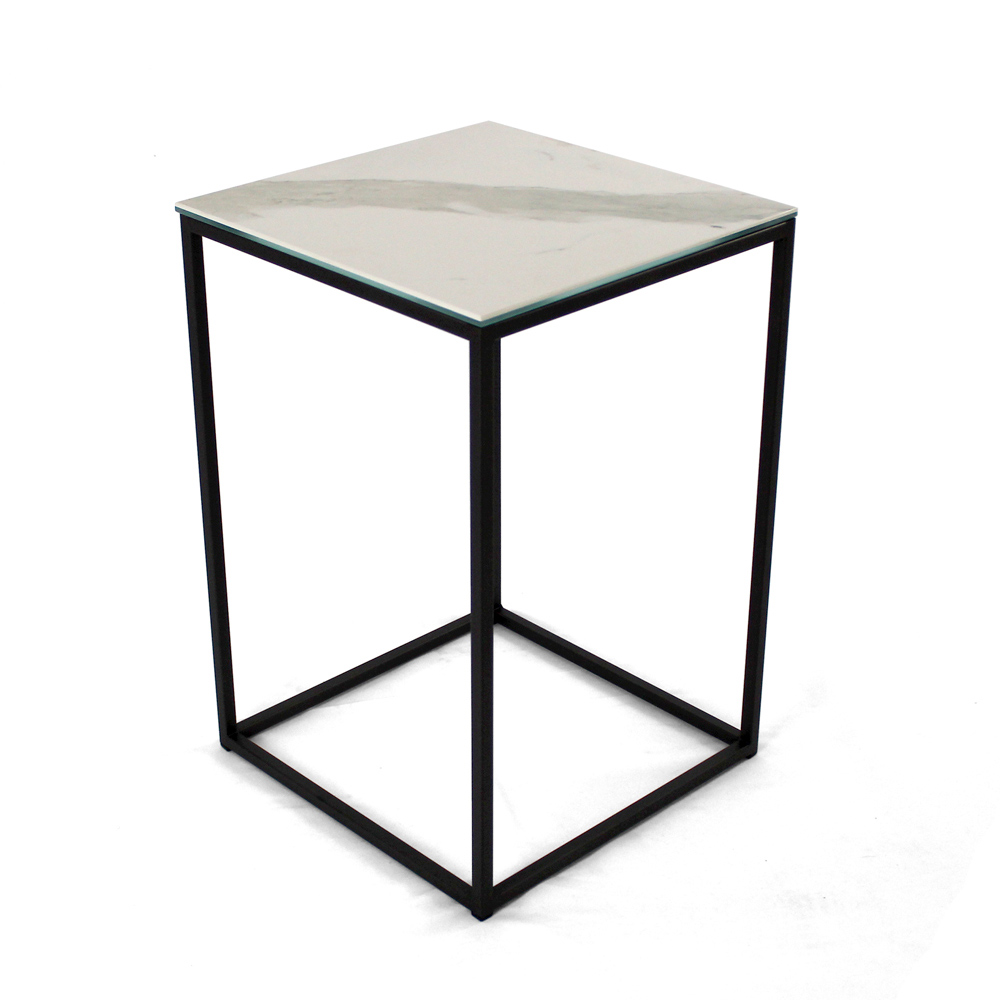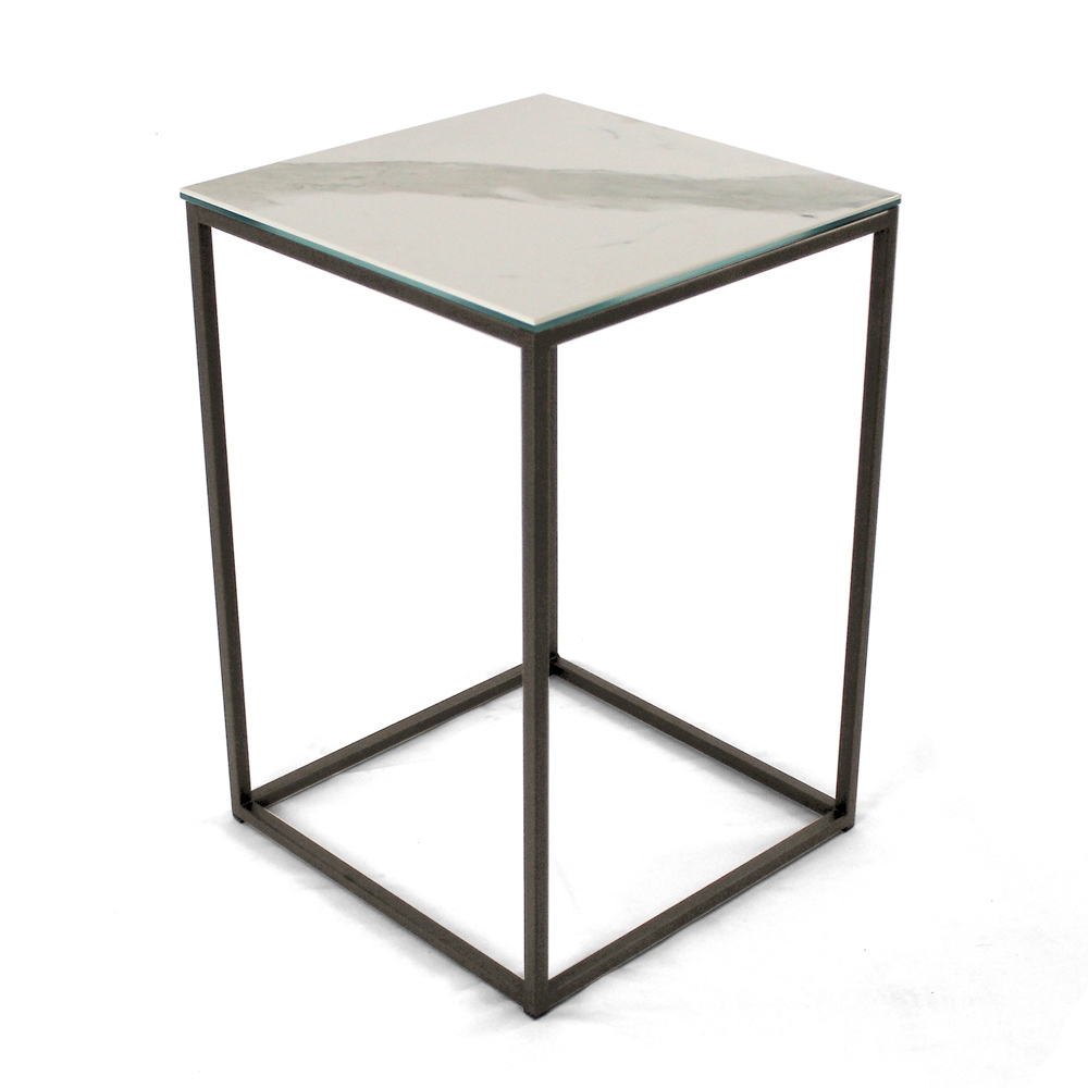 Table basse carrée avec base en acier peint et plateau en grès blanc statuaire veiné mat de 3 mm laminé de verre flotté de 6 mm. Les tables basses de style moderne représentent le meuble parfait pour compléter la décoration de n'importe quel salon et salle de séjour. Ces produits sont uniques, élégants et fonctionnels à la fois grâce à leurs finitions simples et harmonieuses qui les rendent adaptés à tous les besoins et occasions d'utilisation. Les matériaux utilisés pour la construction garantissent une grande qualité et résistance même au fil du temps.