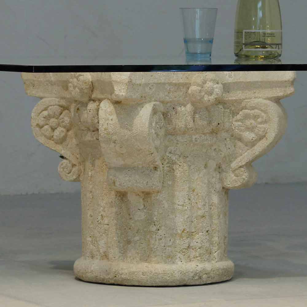 La table basse Balos est faite entièrement en Italie. La base est faite en pierre naturelle de Vicenza, qui à été sculptée à la main à partir d'un bloc massif de pierre. Au-dessus de la base il y à un plateau en cristal float de 12 mm d'épaisseue, appuyé à la base.