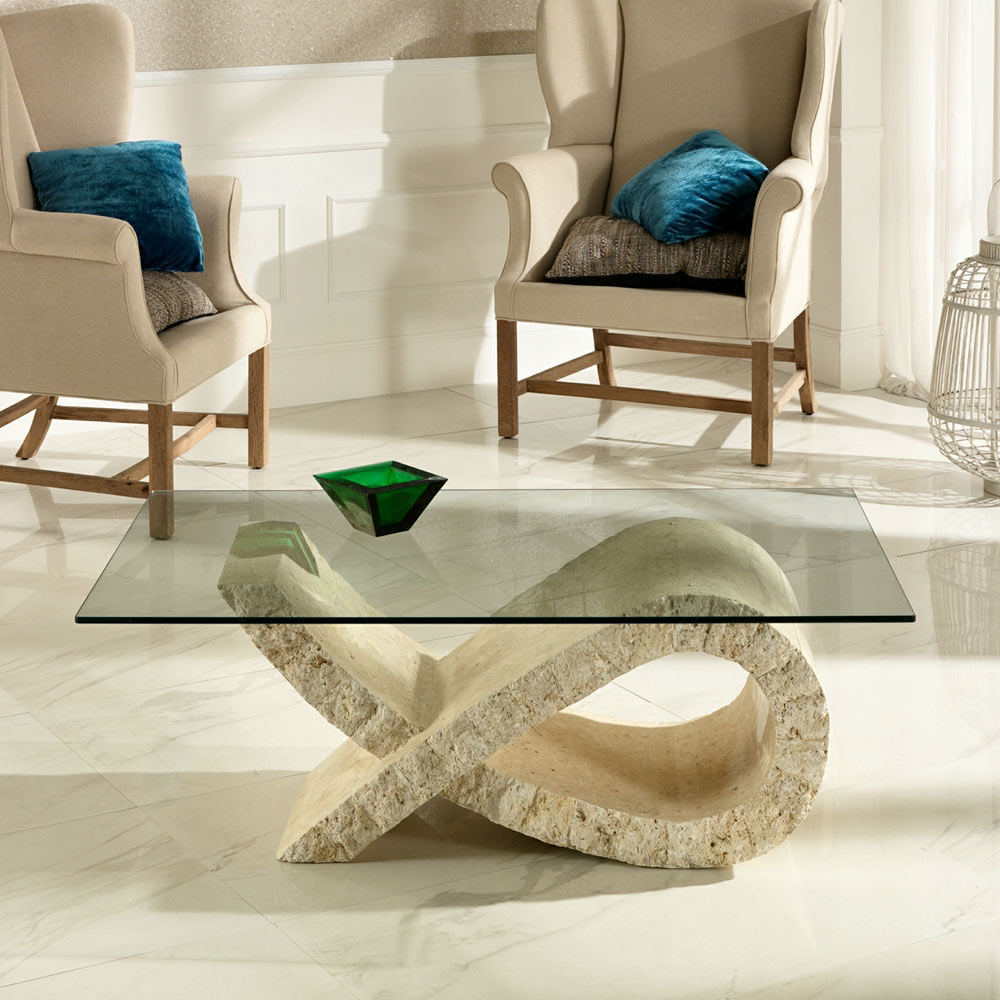 Elle possède une structure en pierre fossile avec une finition en agate blanche et un plateau en verre à bord poli de 10 mm.