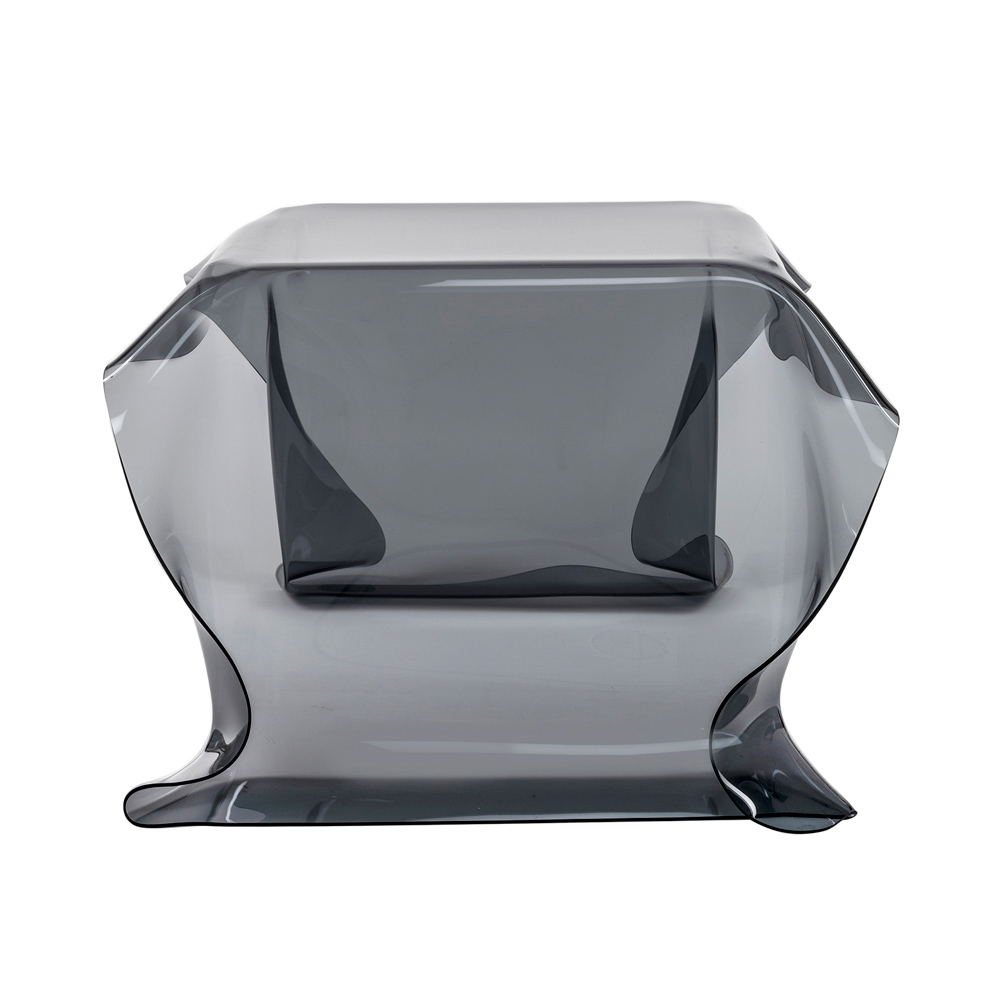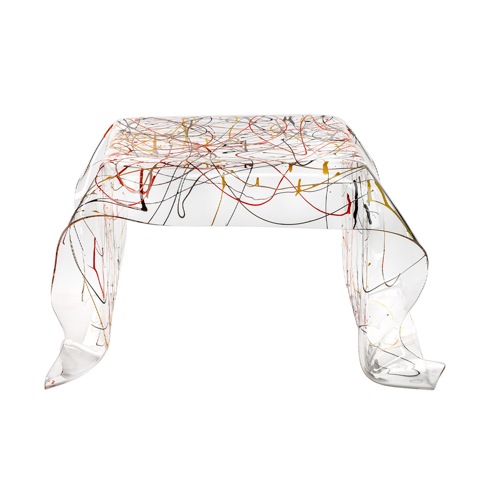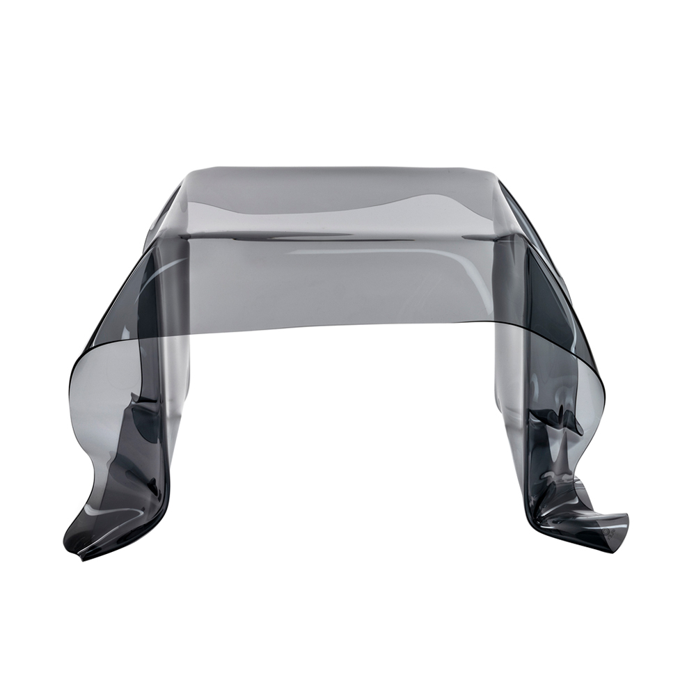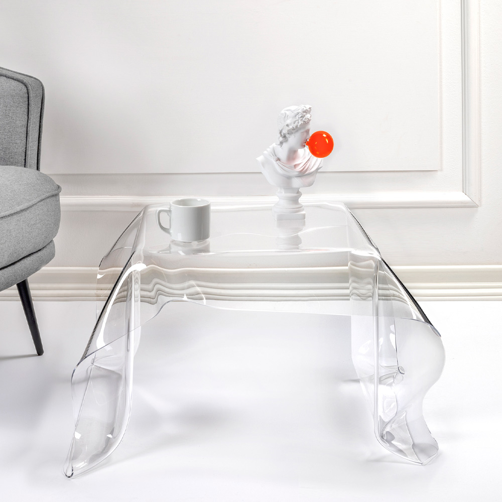 Réalisée avec une feuille de plexiglas PMMA polymère 100% vierge , la table basse est le résultat d'un processus artistique unique : chaque pièce est drapée à la main à haute température , transformant le matériau en un objet au style unique et irremplaçable. La technique utilisée confère à chaque table basse un caractère distinctif, presque comme si chaque courbe racontait l'histoire de sa création.