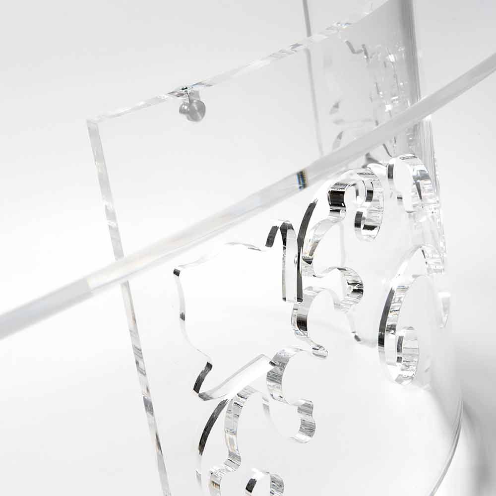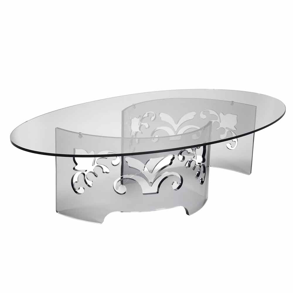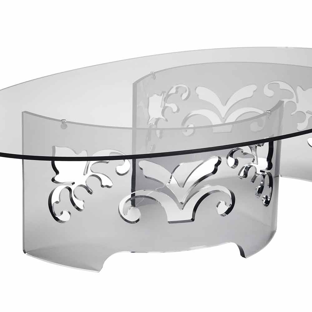 Table basse ovale en plexiglas transparent ou fumé avec base décorée découpée au laser fabriquée en Italie.