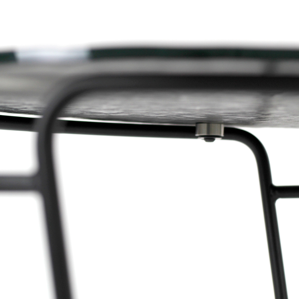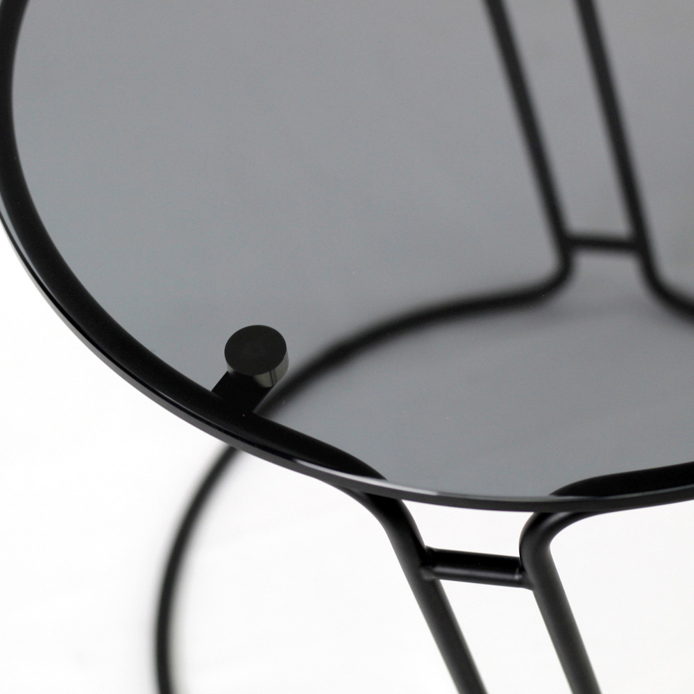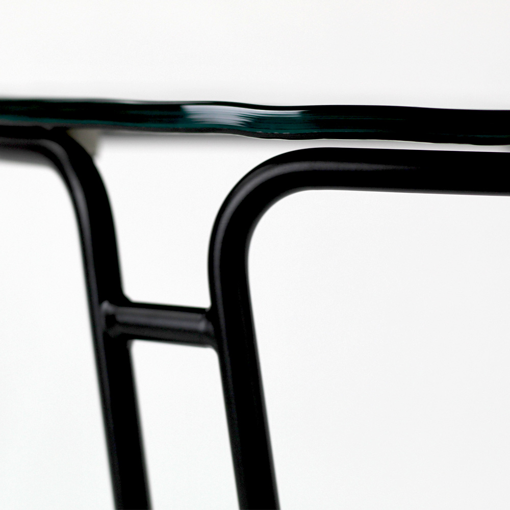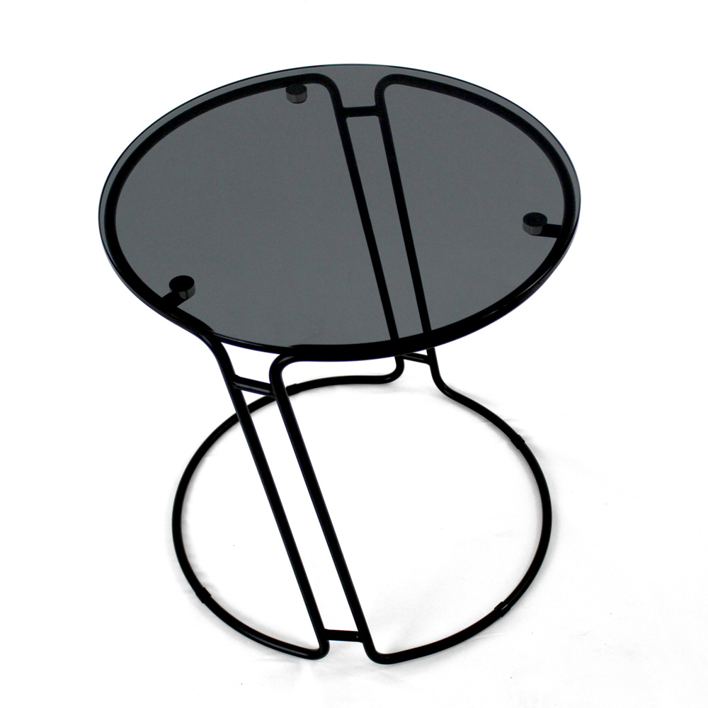 Table basse ronde avec base en acier peint et plateau en verre.