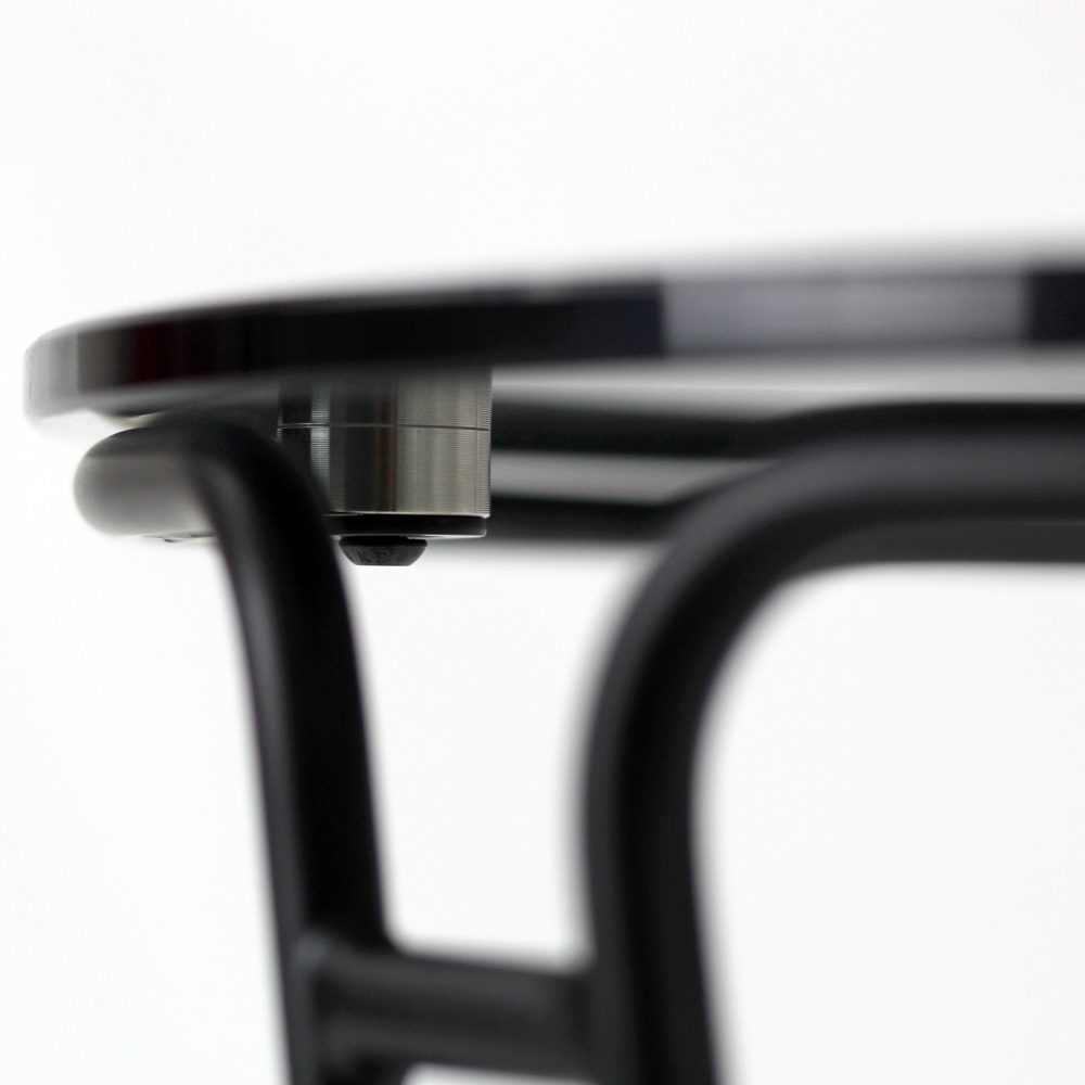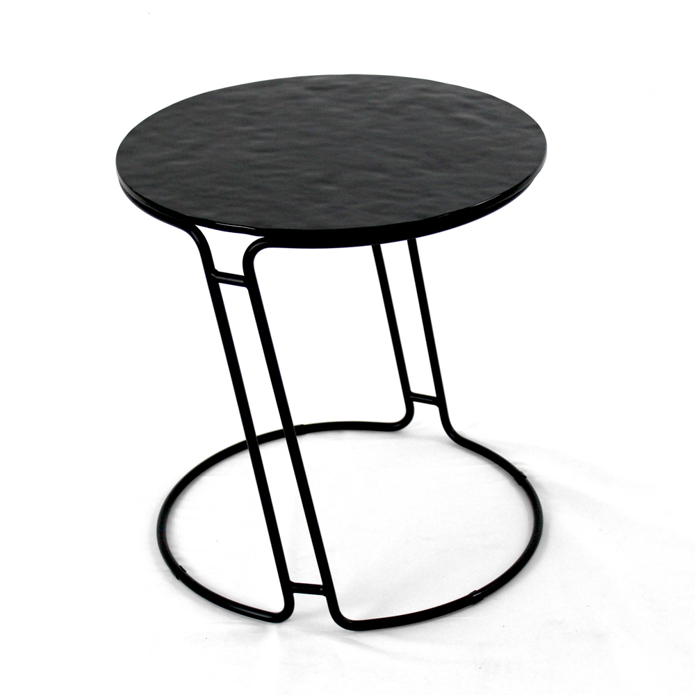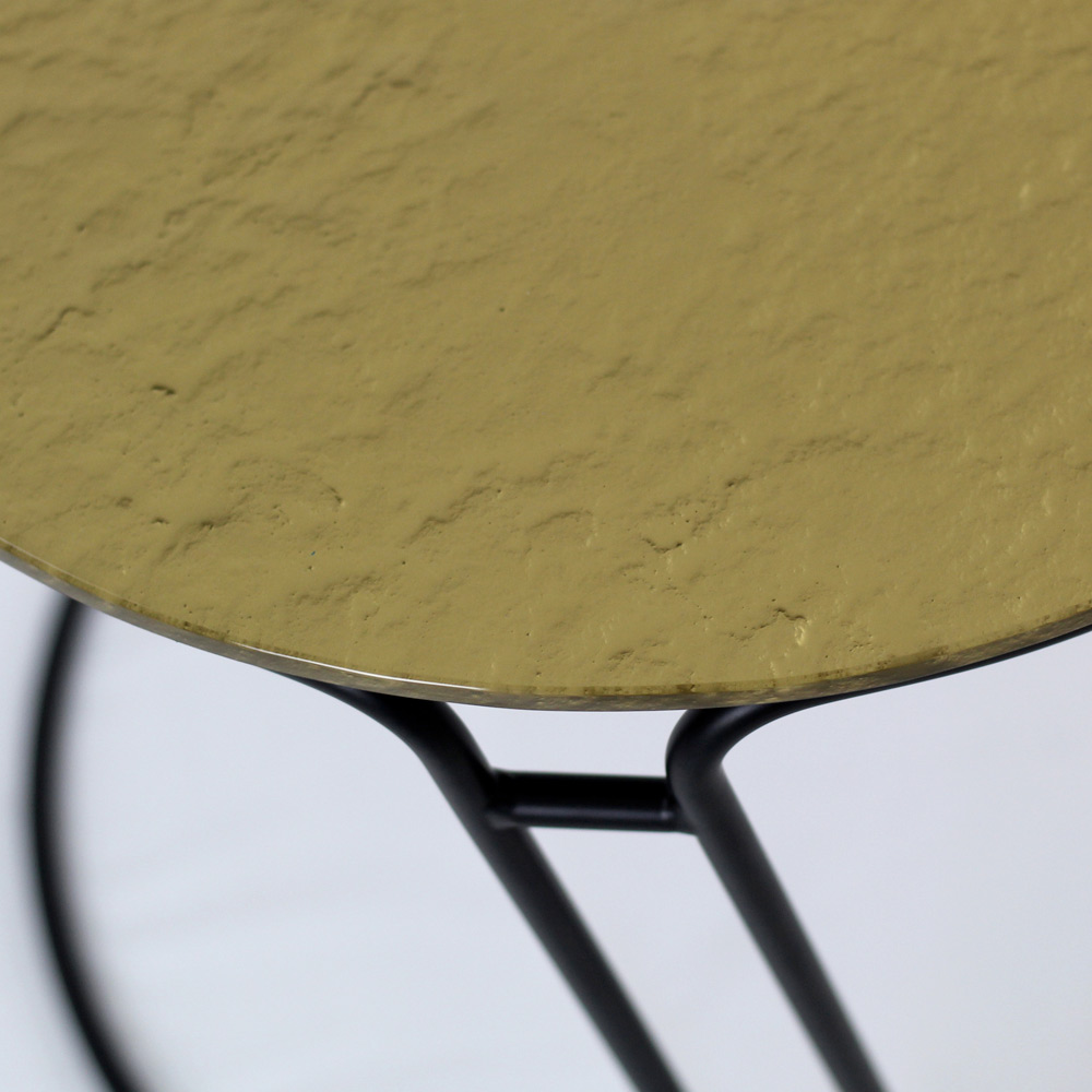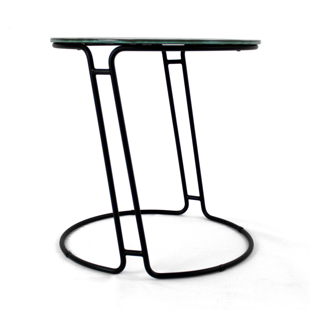 Table basse ronde avec base en acier peint et plateau en verre.