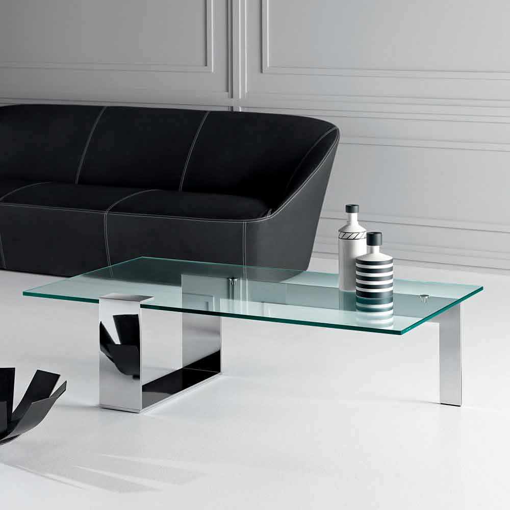 Table basse basse au design moderne avec plateau en verre extra-clair et base en métal, fabriquée en Italie.