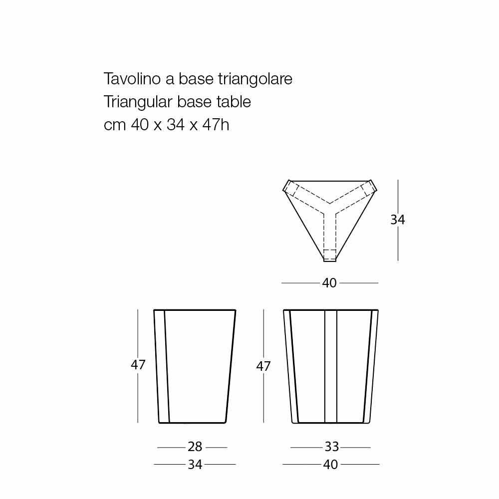 Cette table basse d'extérieur se caractérise par un design triangulaire original et moderne et, avec des lignes essentielles, peut être utilisée seule ou en combinaison avec d'autres similaires, pour créer différentes formes et structures avec un plus grand espace de support. Entièrement réalisé en métal , grâce au traitement de cataphorèse, avant revêtement en poudre, il est particulièrement résistant aux agents atmosphériques. Épaisseur supérieure de 3 mm.