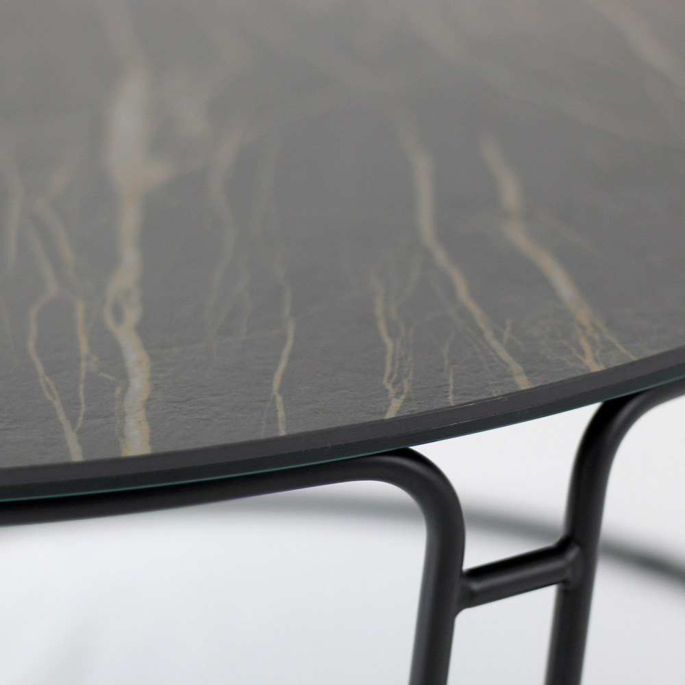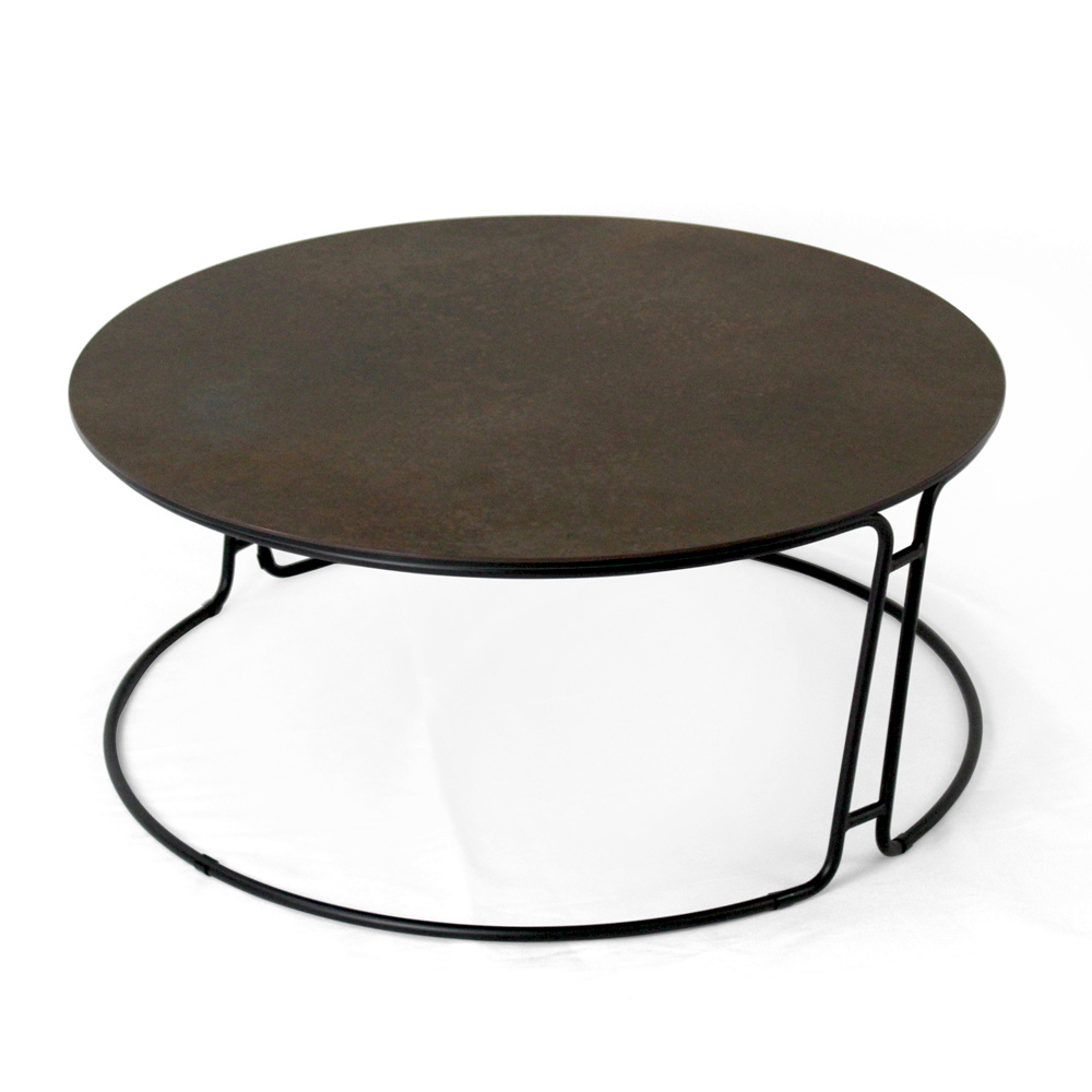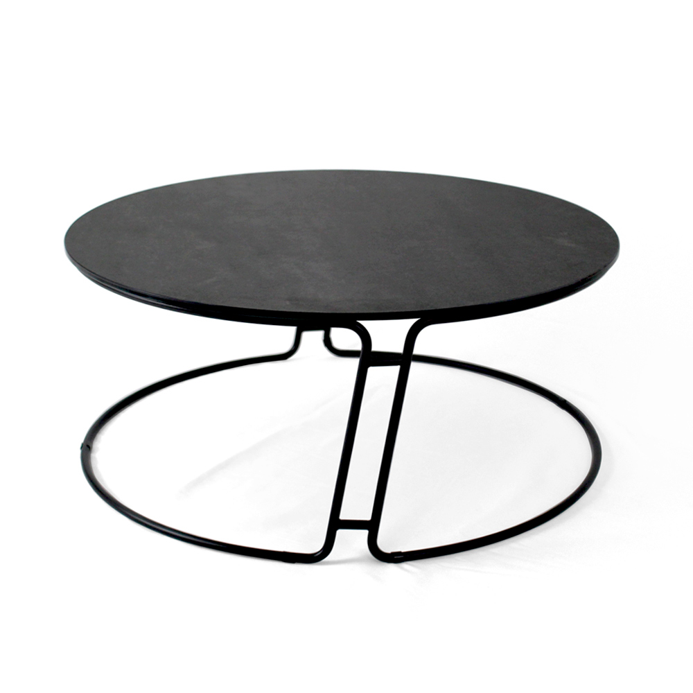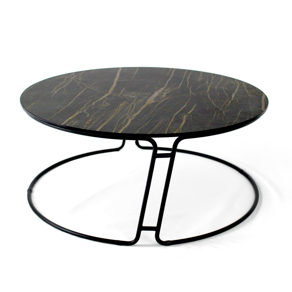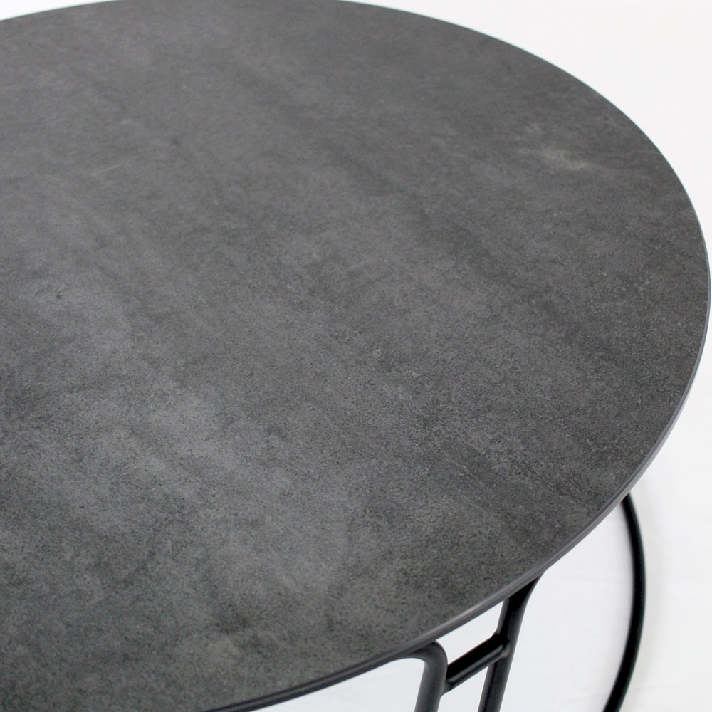 Table basse ronde avec base en acier peint et plateau en grès cérame.