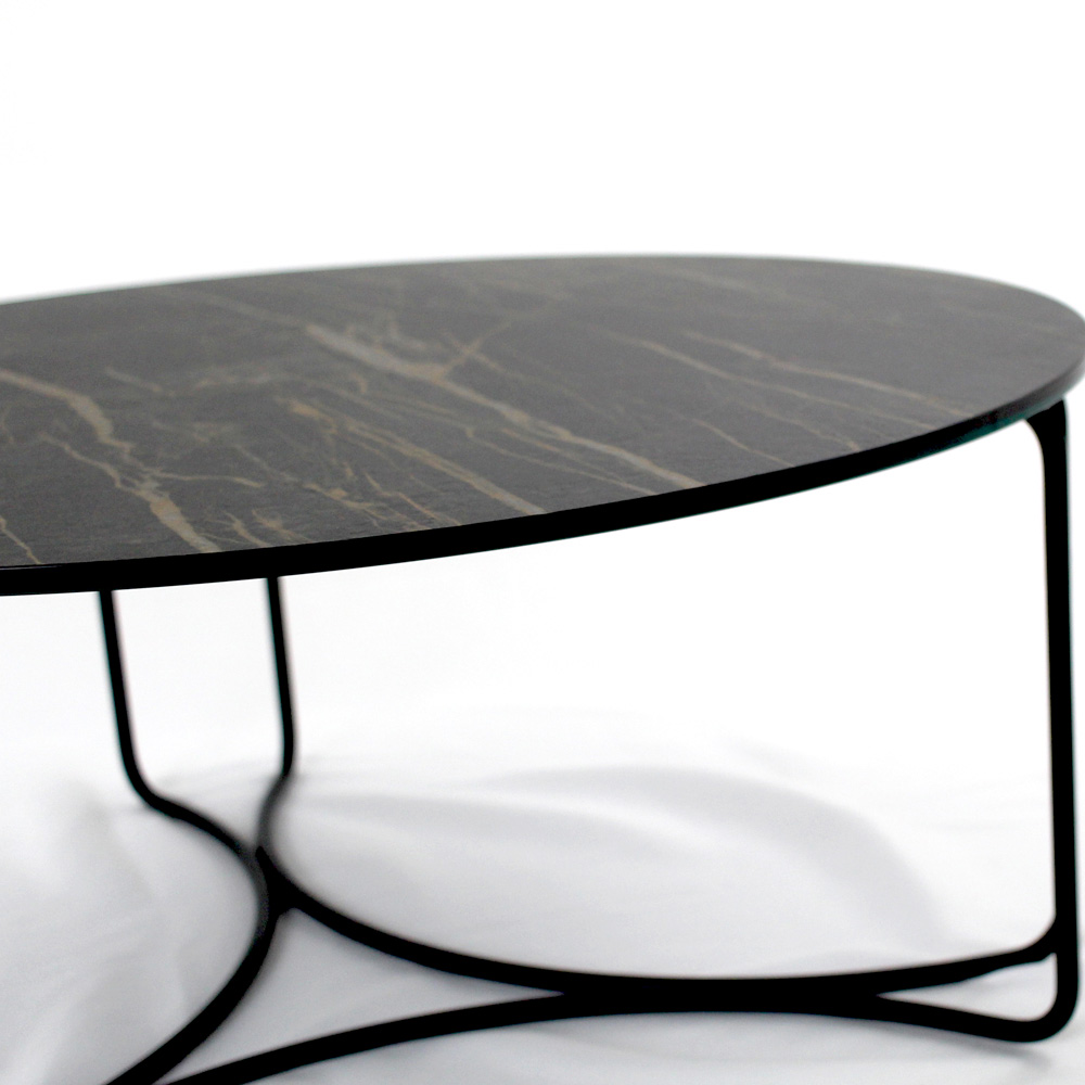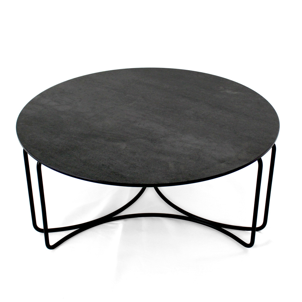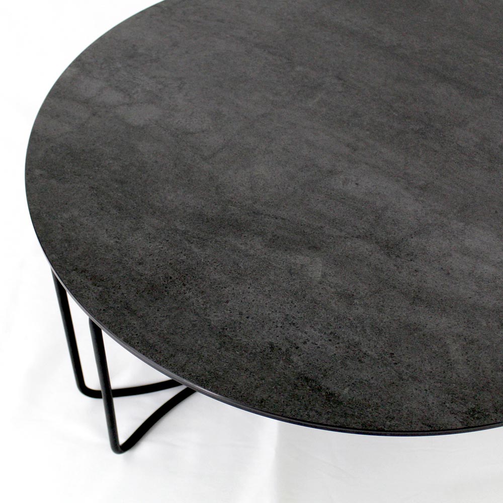 Table basse ronde avec base en acier peint et plateau en grès cérame.
