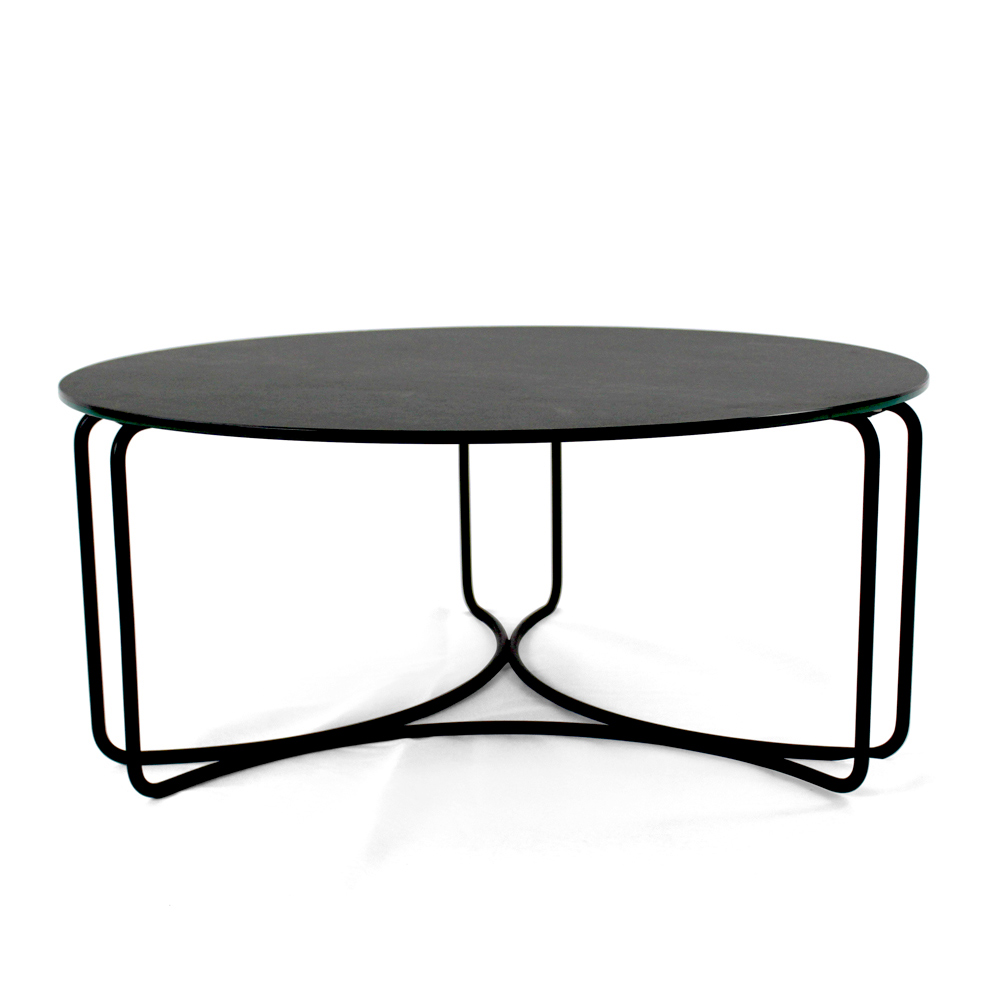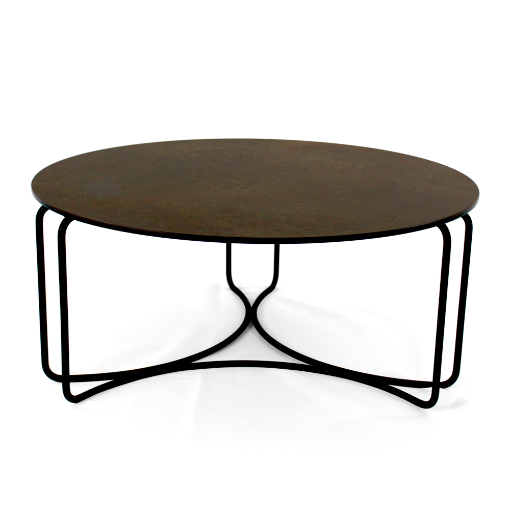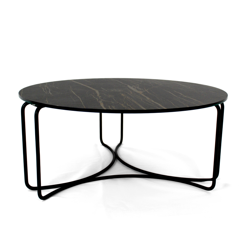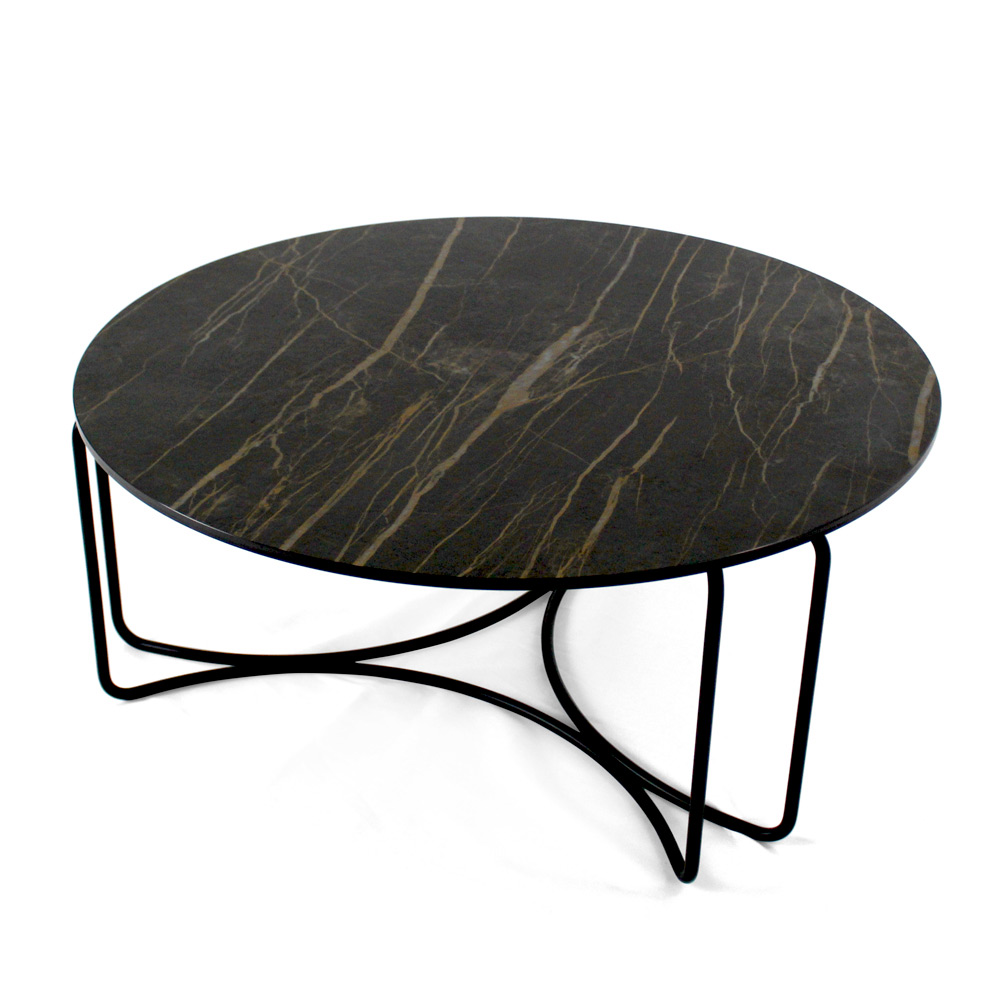 Table basse ronde avec base en acier peint et plateau en grès cérame.