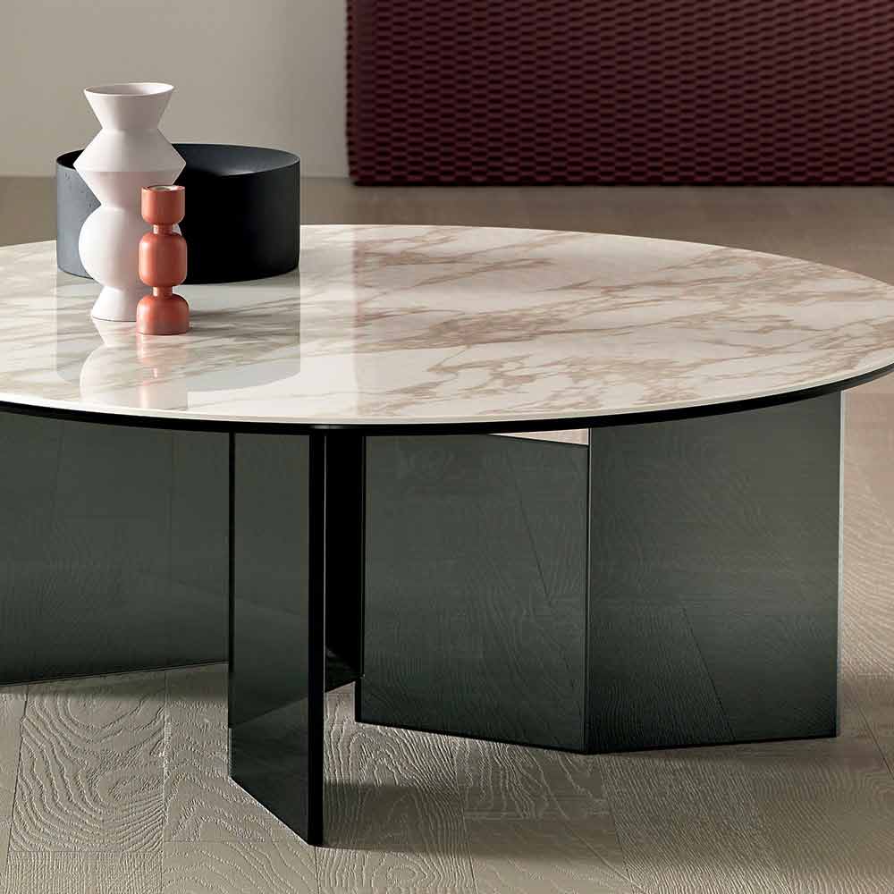 Fabriqué en verre fumé pour la base et un plateau en céramique calacatta polie arabesque , c'est un meuble fabriqué à la main en Italie avec des matériaux de haute qualité, idéal pour le salon.