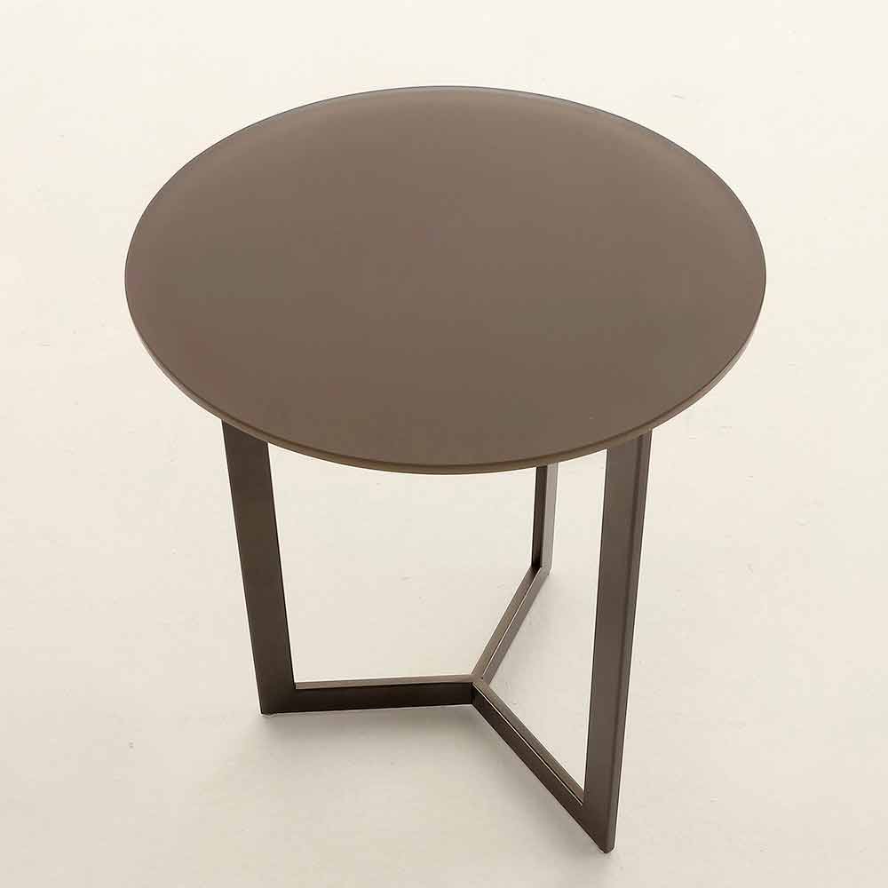 Table basse simple et élégante fabriquée en Italie avec plateau rond en verre satiné anti-traces de doigts et structure en métal peint marron .