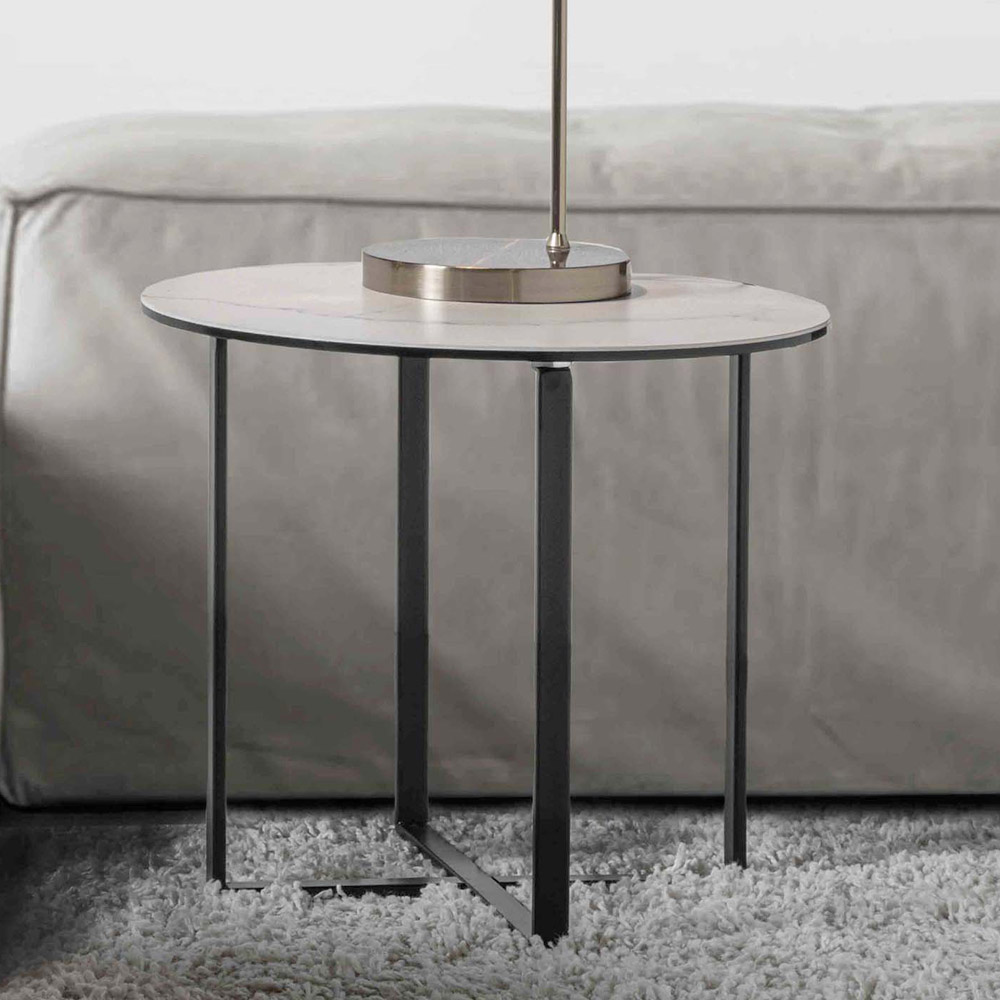 Table basse moderne avec plateau rond en verre céramique avec finition en marbre blanc et base en métal peint en noir. Son design peut être décrit comme simple et essentiel , parfait pour compléter discrètement n'importe quel salon avec un mobilier moderne. Ce qui augmente son charme, ce sont les matériaux et les finitions choisis, qui parviennent à donner vie à un meuble particulièrement élégant et sobre capable d'enrichir le look de la pièce en agissant comme une surface de support pratique pour les boissons, les livres, les magazines ou tout autre objet vous voulez garder à portée de main et en même temps comme un élément décoratif raffiné.