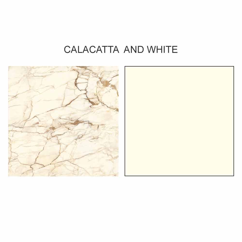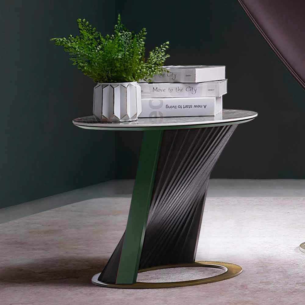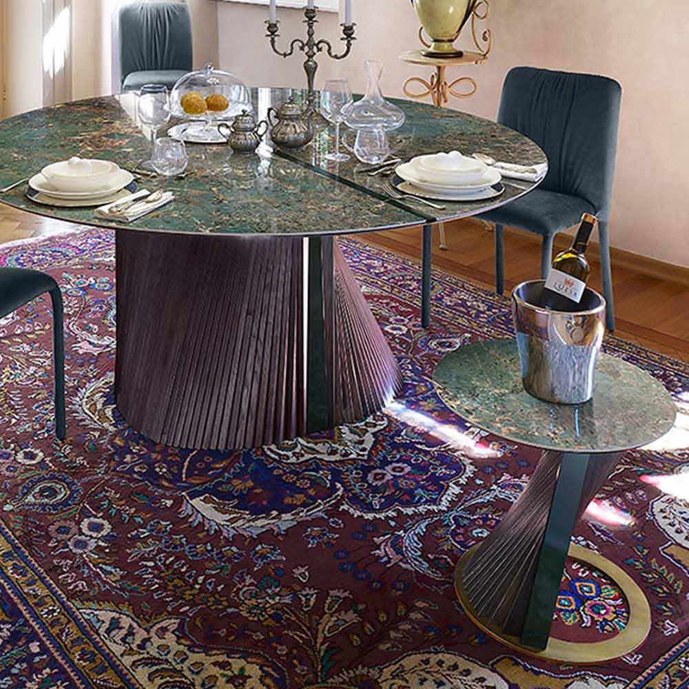 Table basse design avec plateau rond en grès cérame effet marbre, article de luxe Made in Italy.