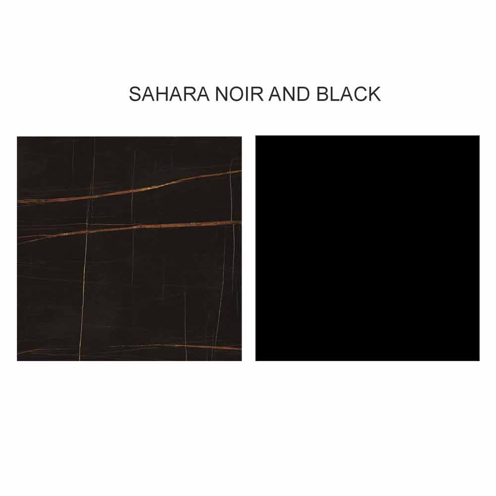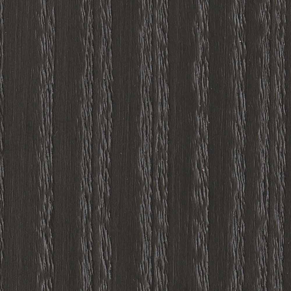 bois de frêne huilé à la main en finition gris noir. Le plateau, quant à lui, a une forme ronde et est en grès cérame poli effet marbre.