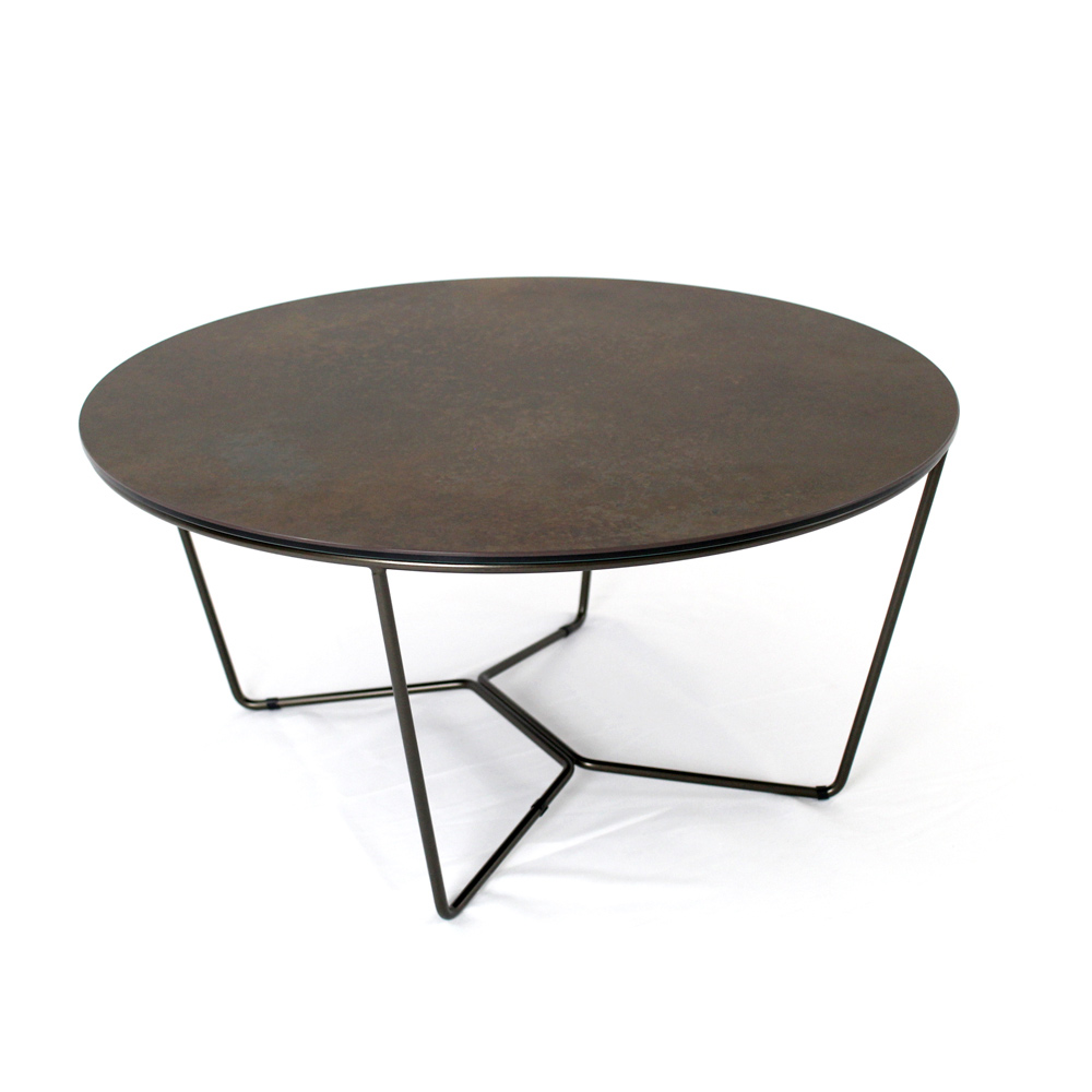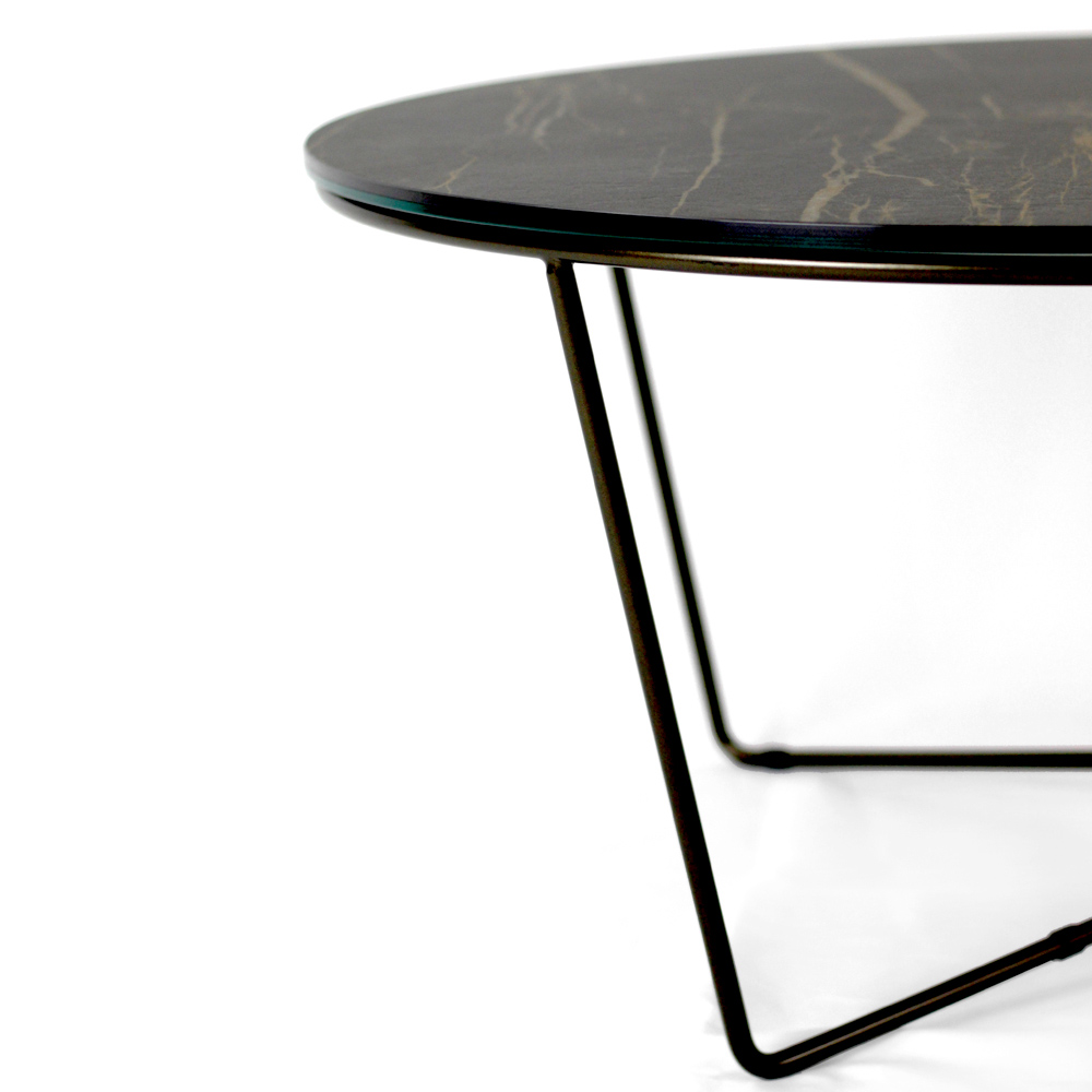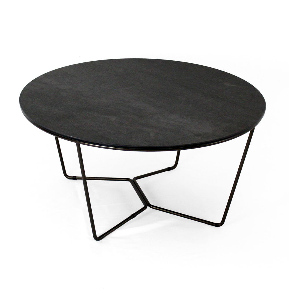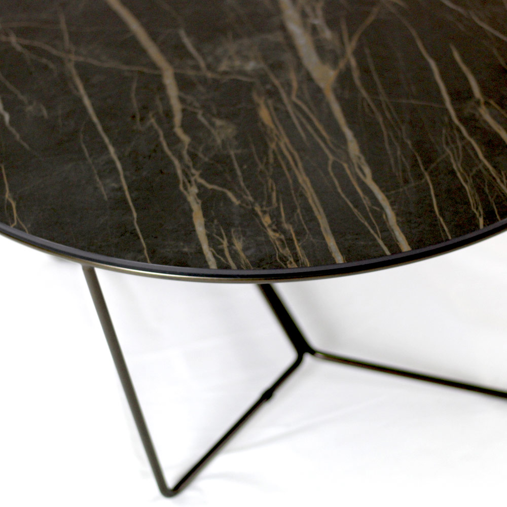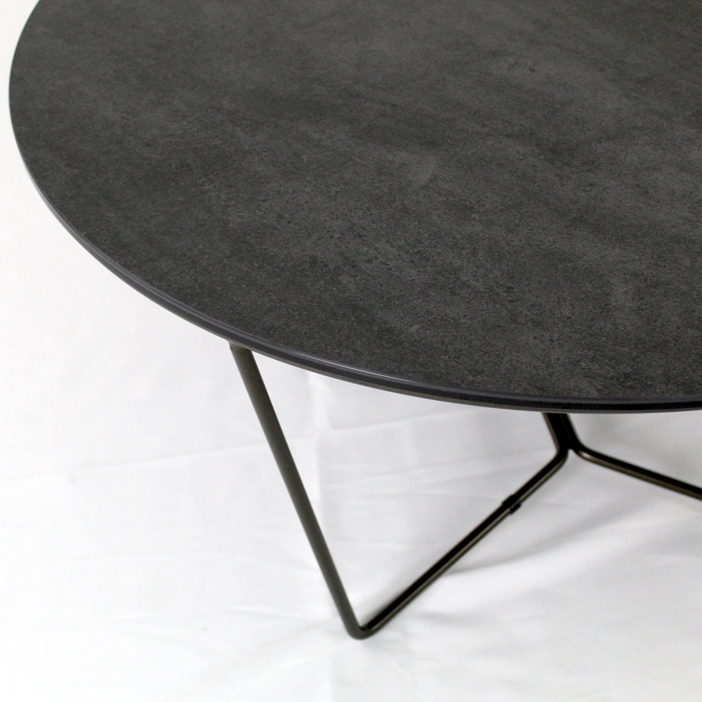 Table basse ronde avec base en acier peint et plateau en grès cérame.