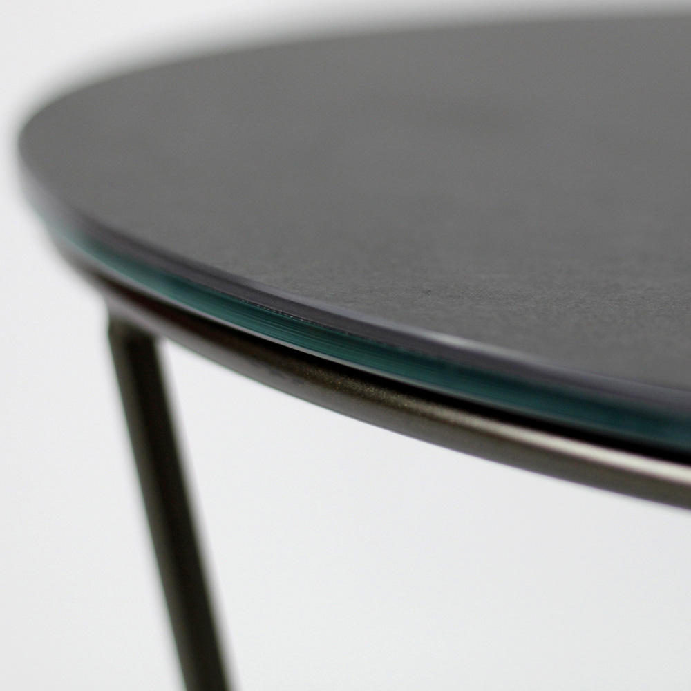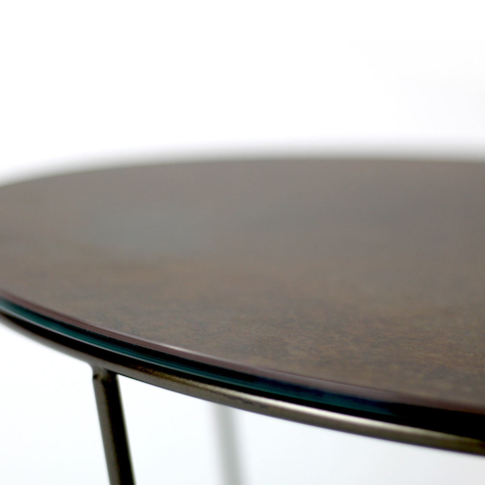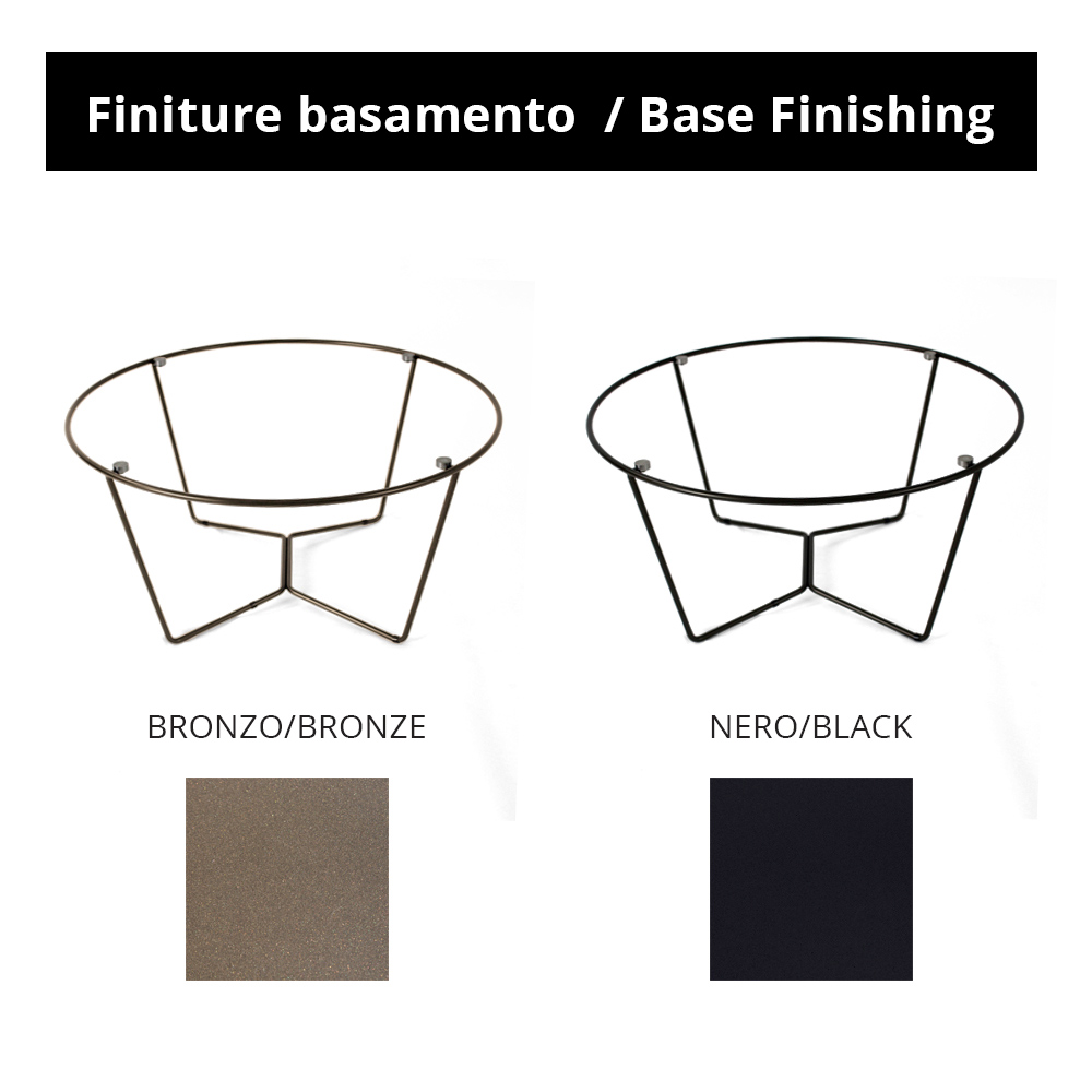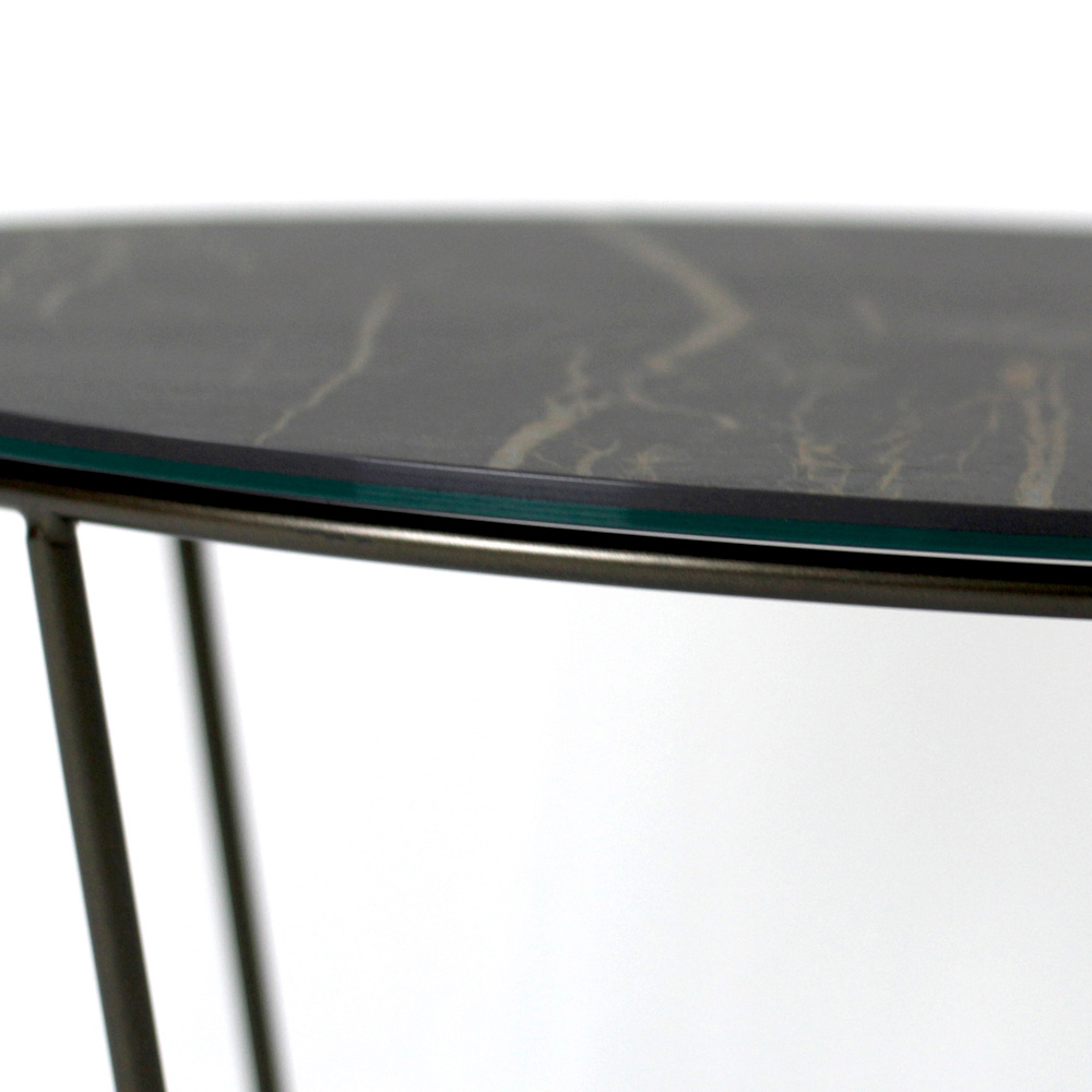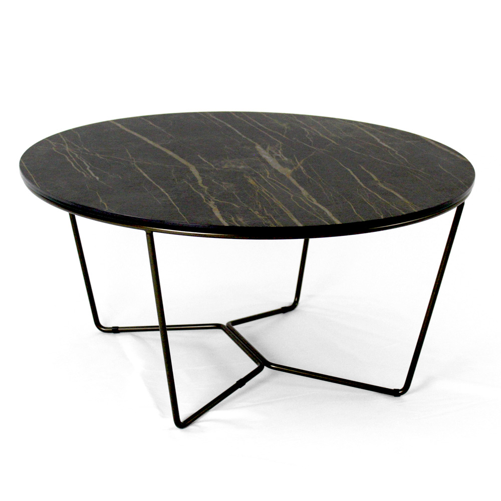 Table basse ronde avec base en acier peint et plateau en grès cérame.