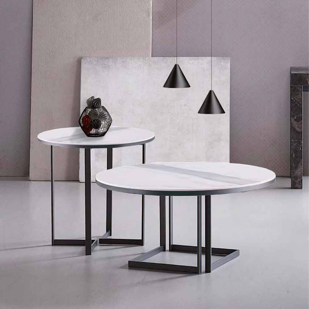Table basse Made in Italy avec piètement en métal laqué gris noir etplateau rond en grès cérame effet marbre poli ou mat de 2 cm d'épaisseur. Sa structure caractérise l'ensemble du design permettant, grâce à sa forme particulière, de créer des jeux de hauteurs, de dimensions et de finitions laissant libre cours à la créativité et vous permettant de meubler votre salon de manière originale et totalement innovante. L'utilisation du métal assure un produit solide avec une excellente durabilité tandis que le grès enrichit le design final, donnant élégance et raffinement à la table et à toute la pièce.