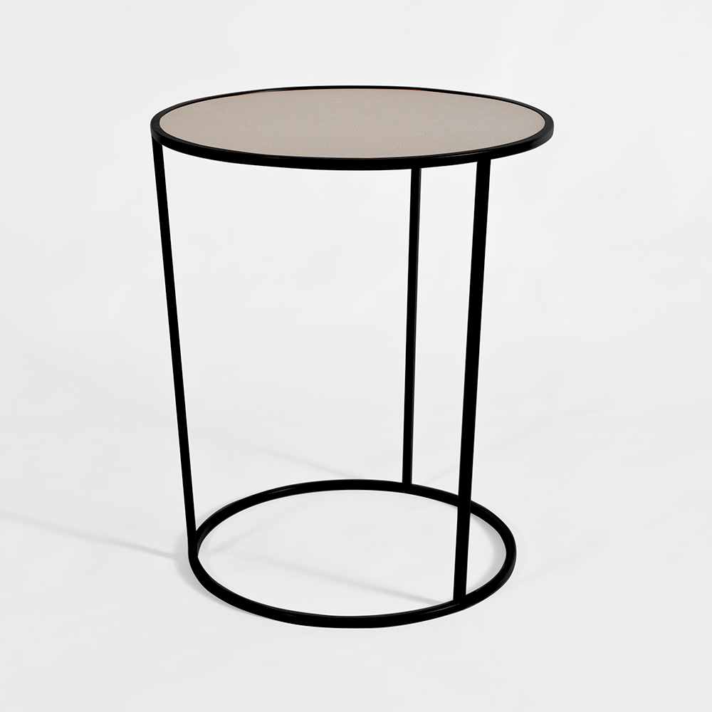 table basse ronde aux lignes minimales et à l'usage pratique possède un plateau en mélaminé cuir fleur. Le