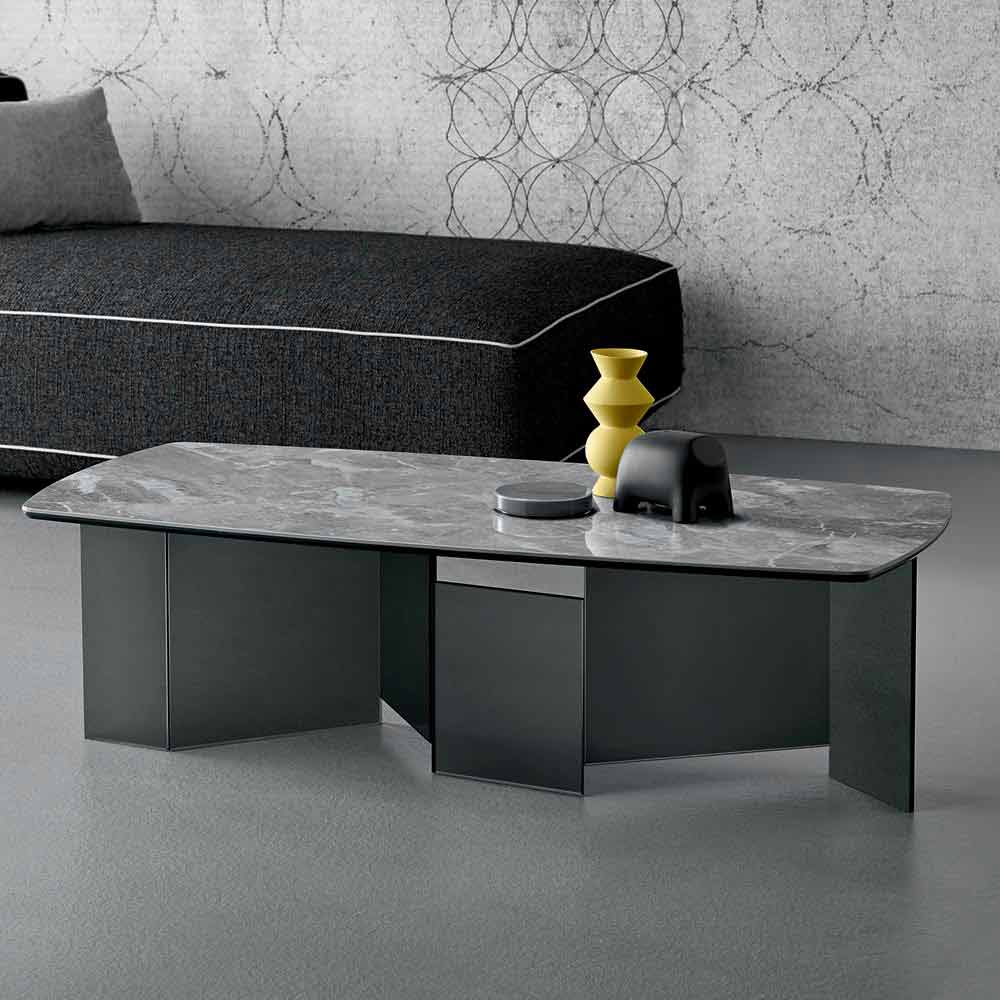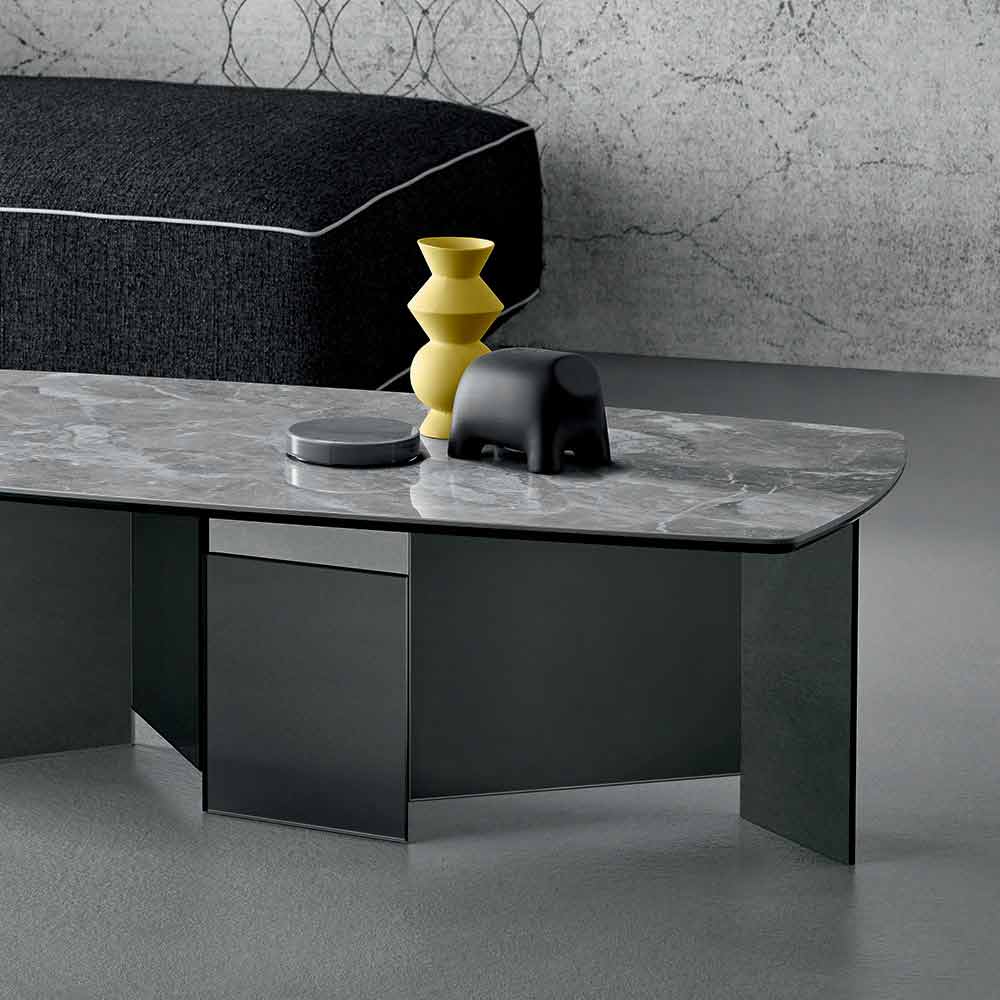 Fabriqué en verre fumé pour la base et un plateau en céramique gris orobique brillant , c'est un meuble fabriqué à la main en Italie avec des matériaux de haute qualité, idéal pour le salon.