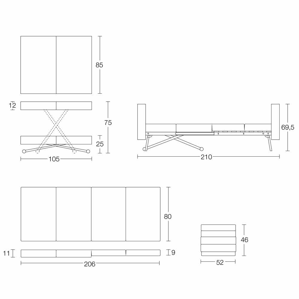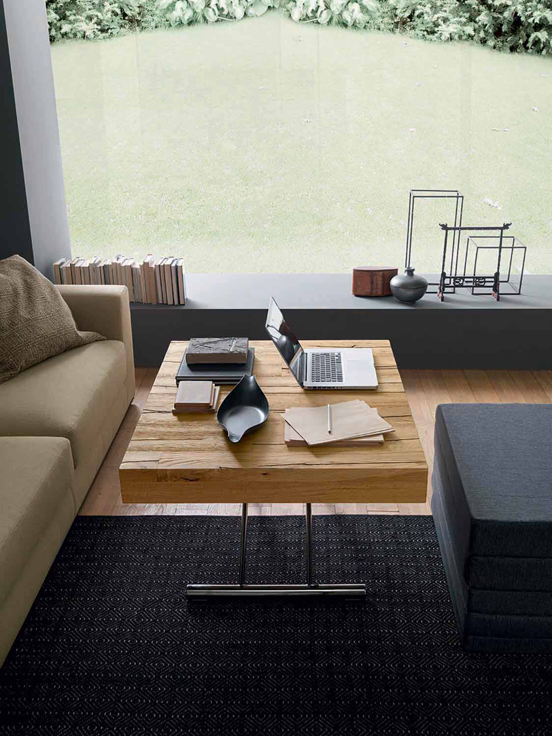 table basse transformable se caractérise par des lignes élégantes et polyvalentes capables de se déplacer en hauteur pour remplir la fonction d'une table à manger qui, si nécessaire, évolue en donnant forme à un lit confortable au design raffiné.