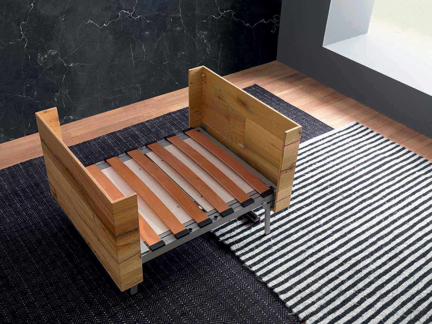 Équipé d'un pouf transformable en matelas (mousse polyuréthane ignifuge D 35), recouvert de tissu gris. Sommier à lattes et panneau en contreplaqué. Pieds de support repliables. Tavoletto