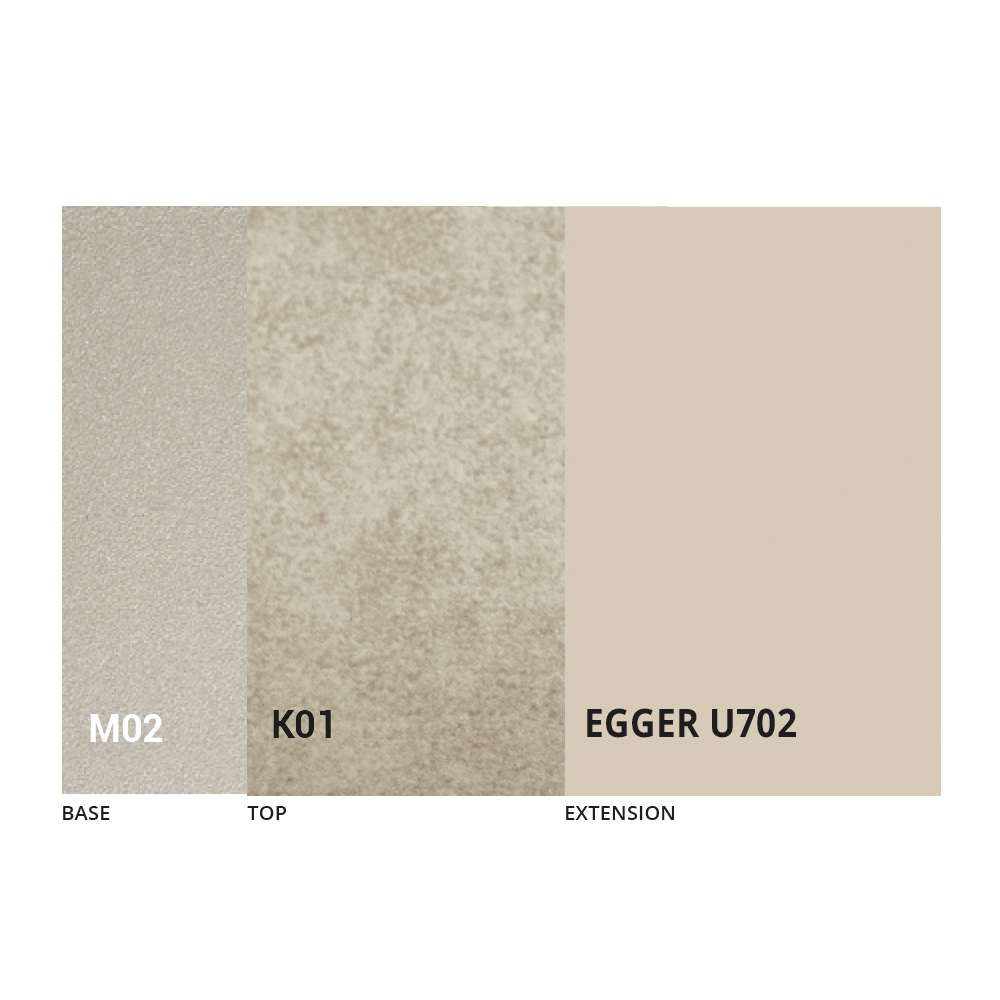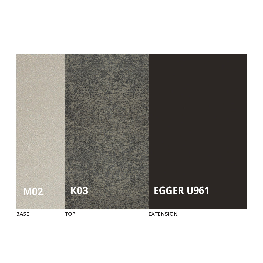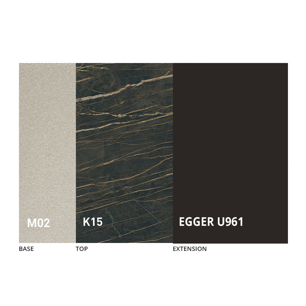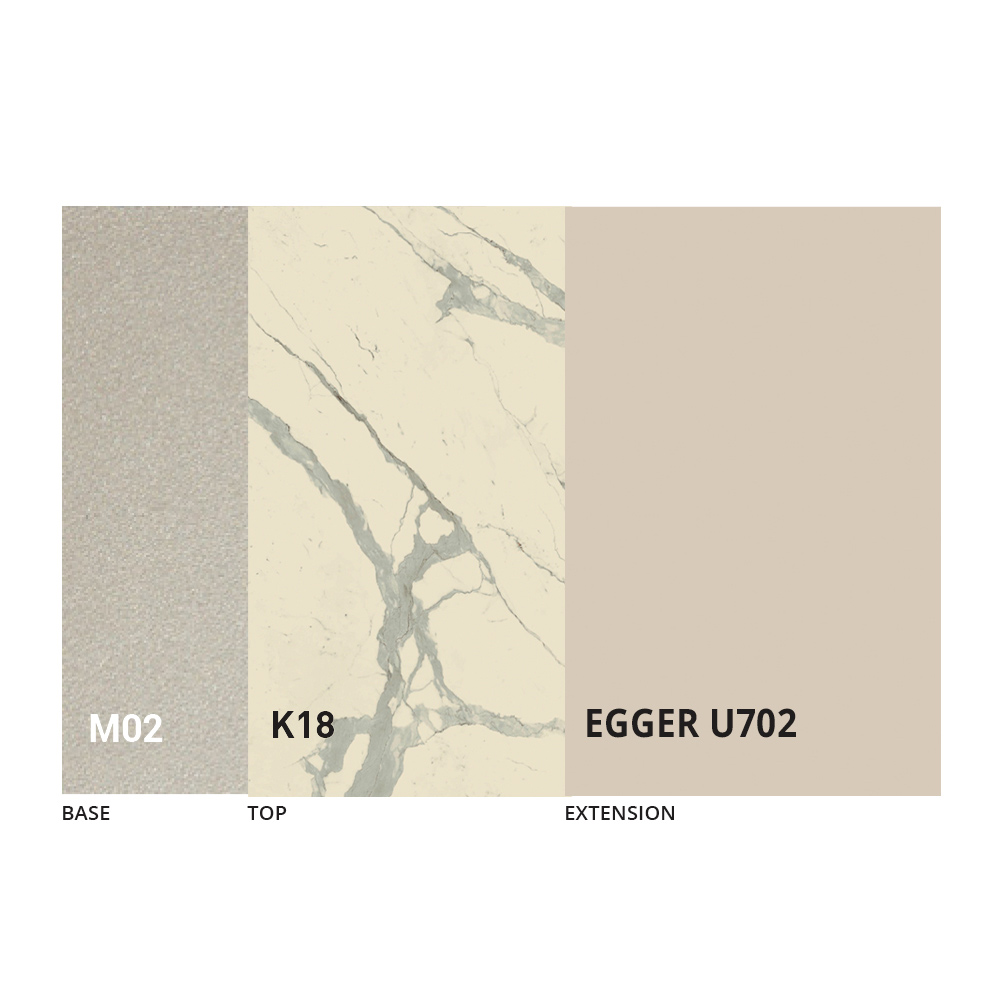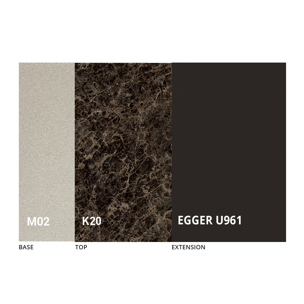 Le plateau est disponible en mélamine, céramique mate, verre et effet mortier dans une large gamme de finitions.