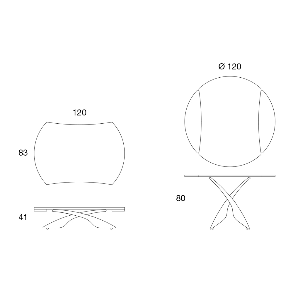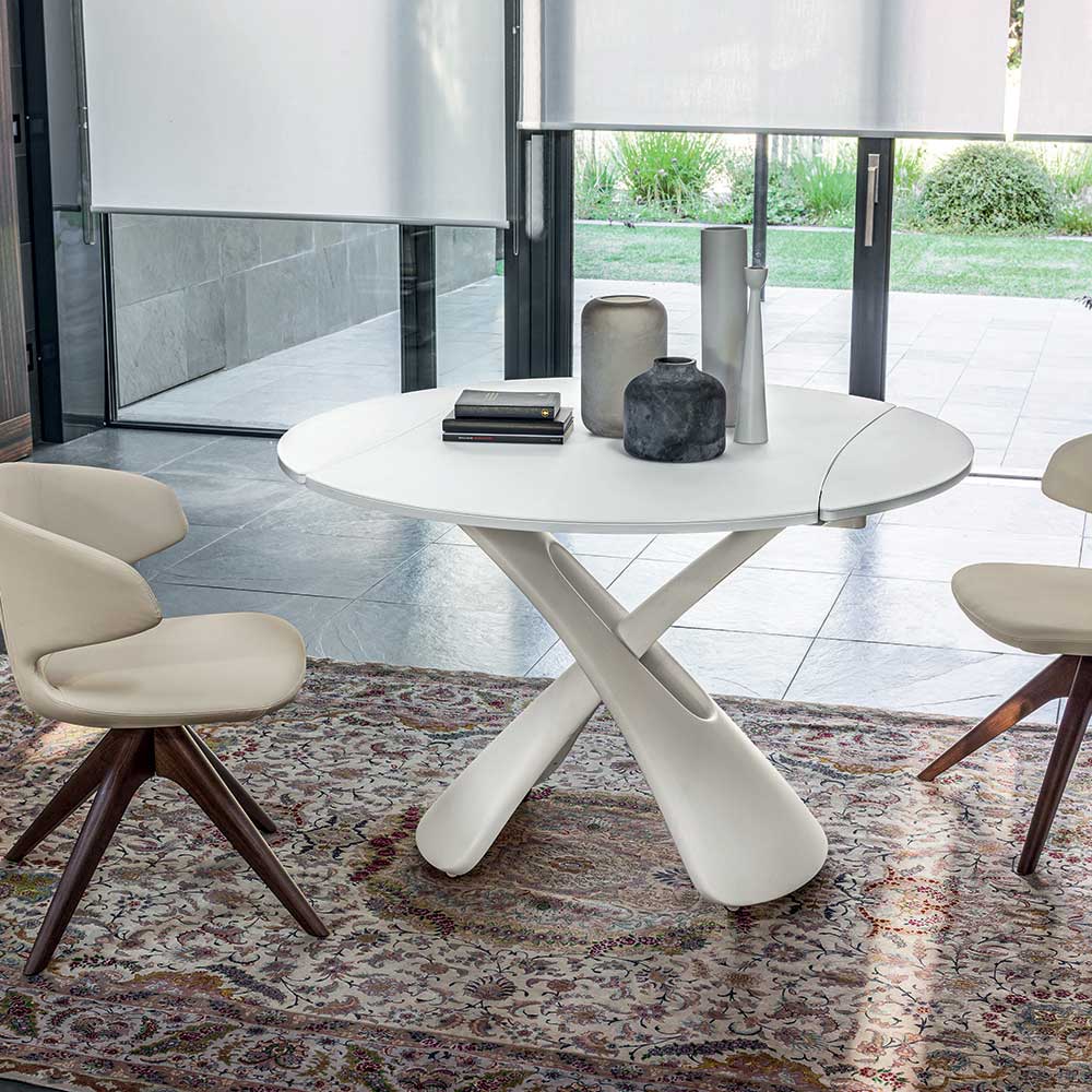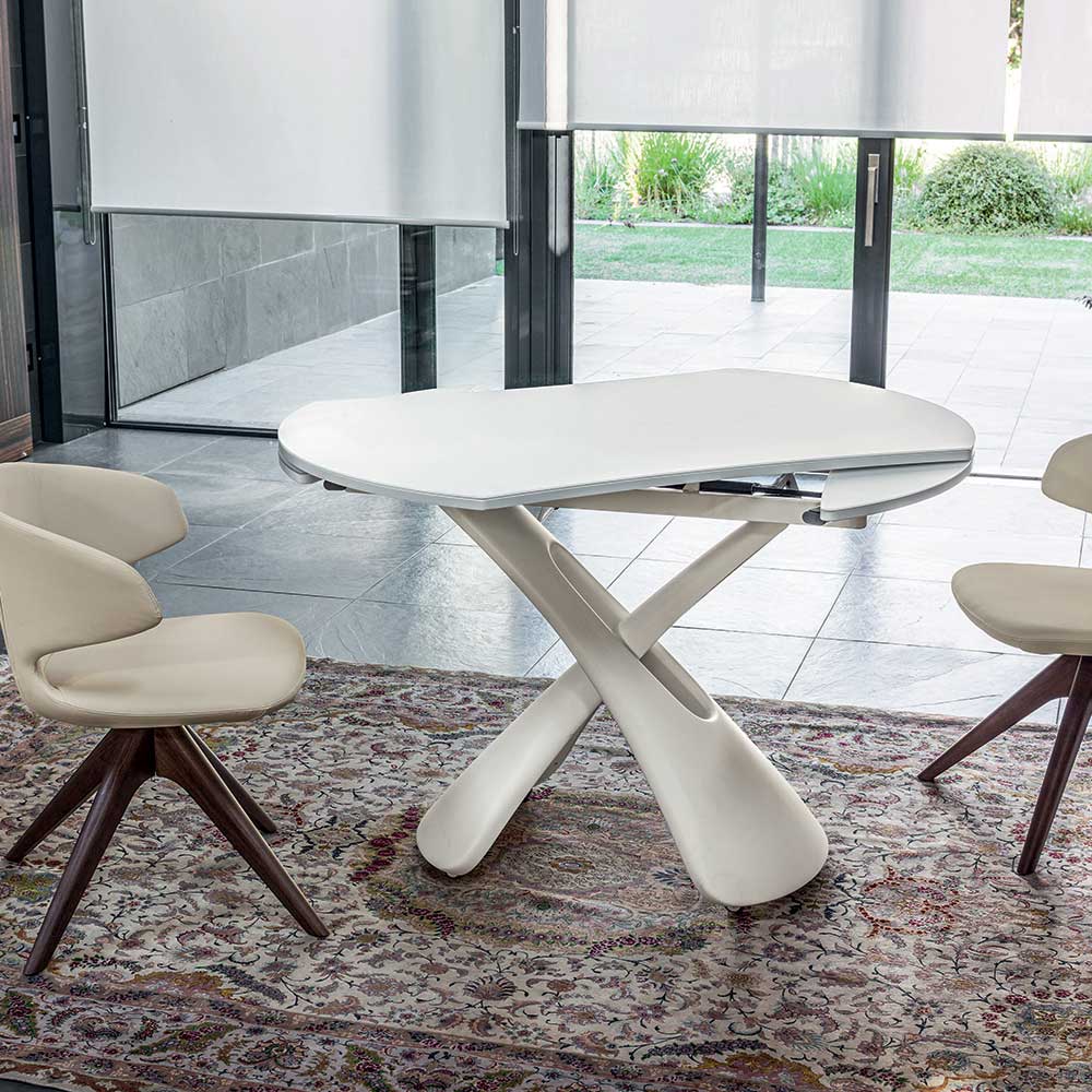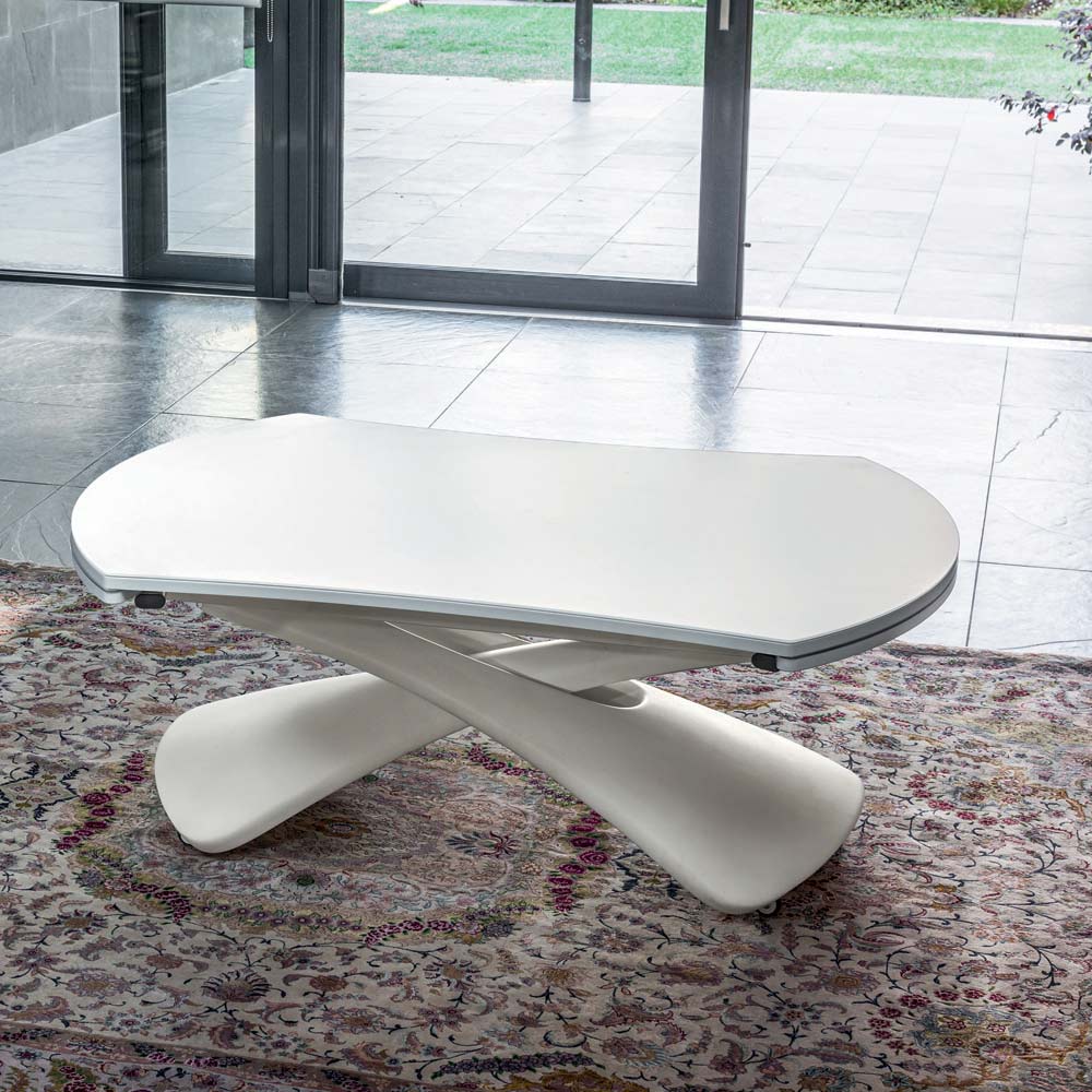 Cette table basse se transforme en table à manger grâce à un mécanisme à gaz,il a une base en métal recouvert de polyuréthane rigide peint dans une finition blanche en relief avec des roues rétractables et une partie supérieure irrégulière qui peut être transformé en un rond en verre gravésur panneau.