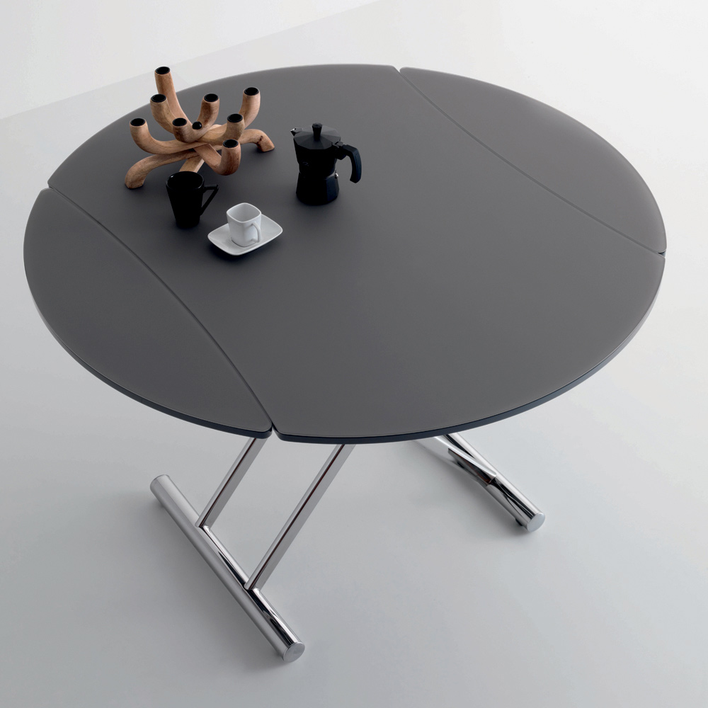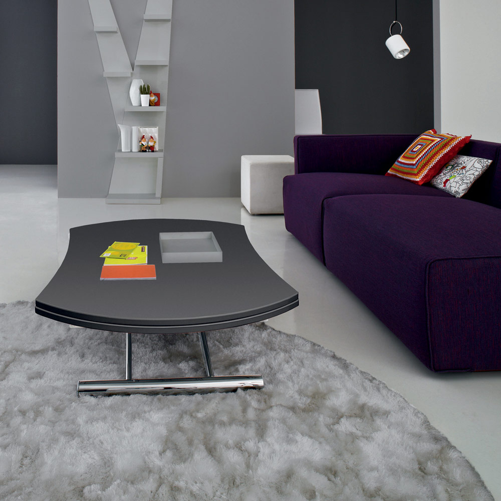 Cette table basse se transforme en table à manger grâce à un mécanisme à gazil a une baseen métal chromé poli avec des roues rétractables et une partie supérieure irrégulière qui peut être transformé en un rond en verre gravésur panneau.