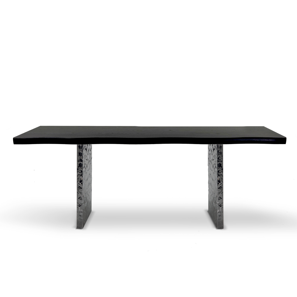 Table design avec plateau en bois plaqué et base en acier martelé fabriquée à la main en Italie.