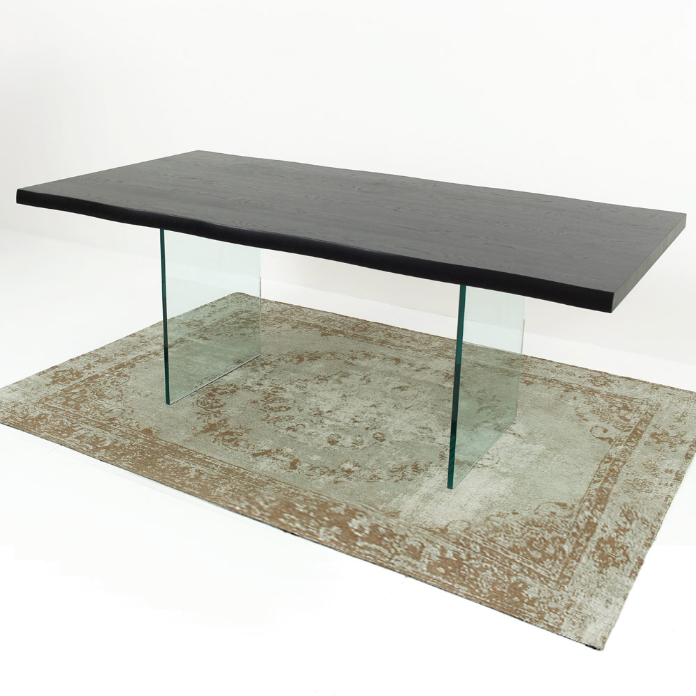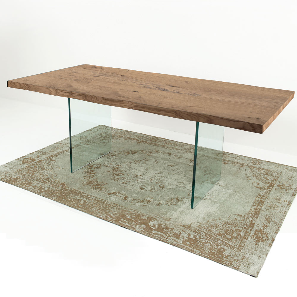 Table à manger moderne avec plateau en bois plaqué et base en verre transparent fabriquée en Italie.