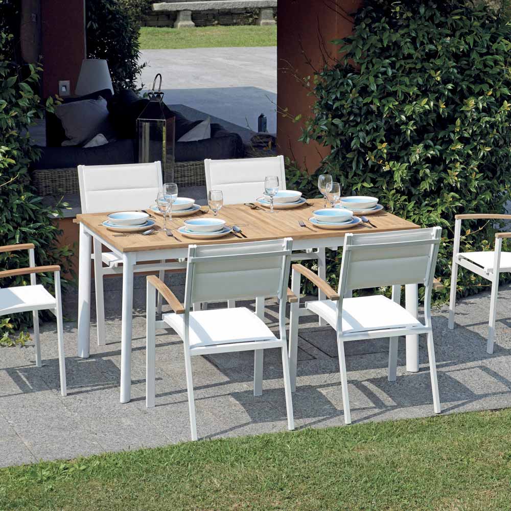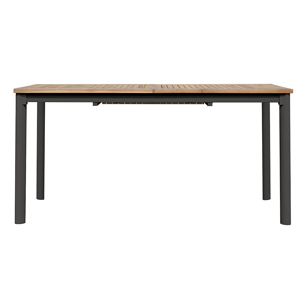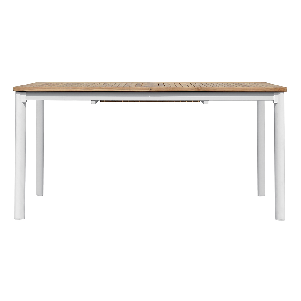 Le plateau de la table est en bois de teck de haute qualité, connu pour sa durabilité et sa résistance aux intempéries. Le teck, avec ses tons naturels chauds, ajoute une touche de chaleur et de sophistication à votre espace extérieur. Les pieds en aluminium robustes et légers offrent une excellente stabilité et résistance à la corrosion, garantissant que la table conserve sa beauté au fil du temps.