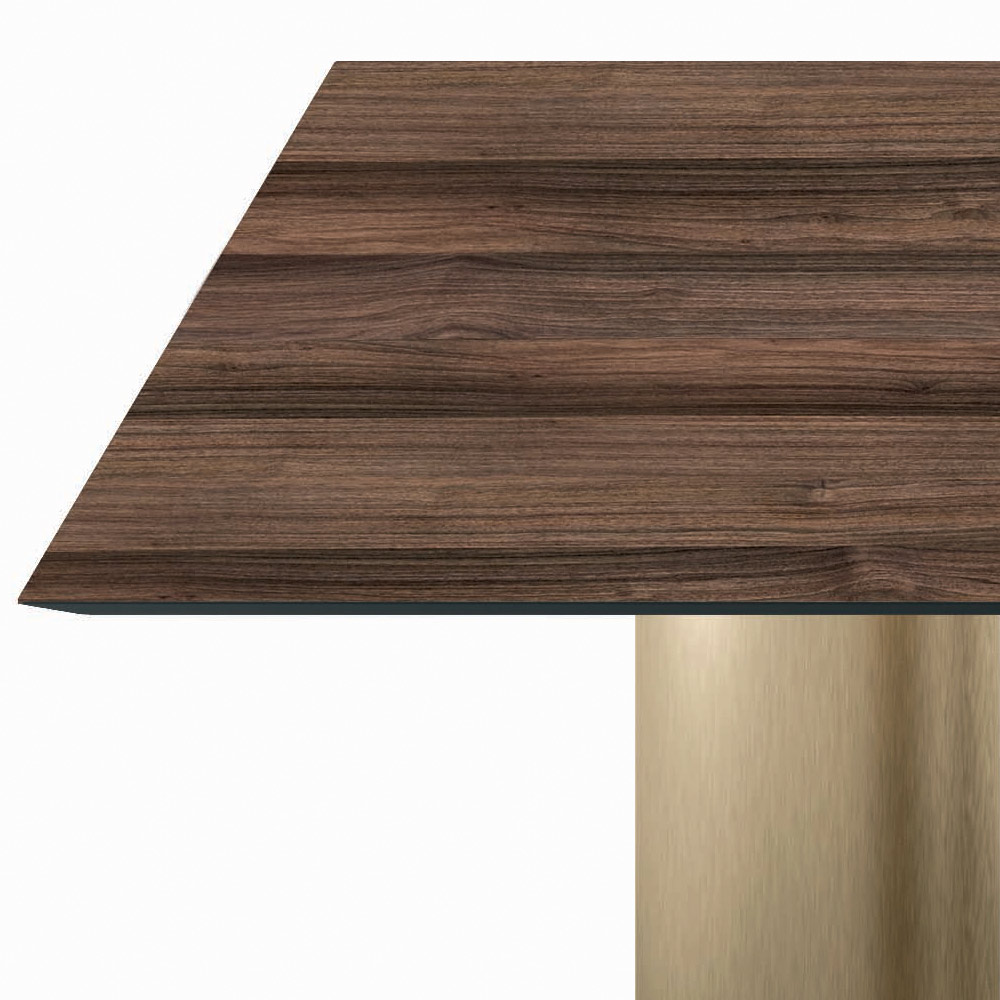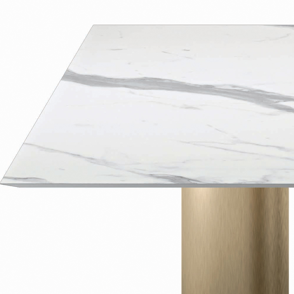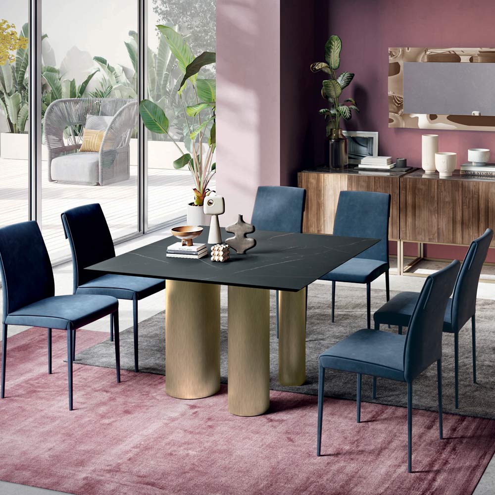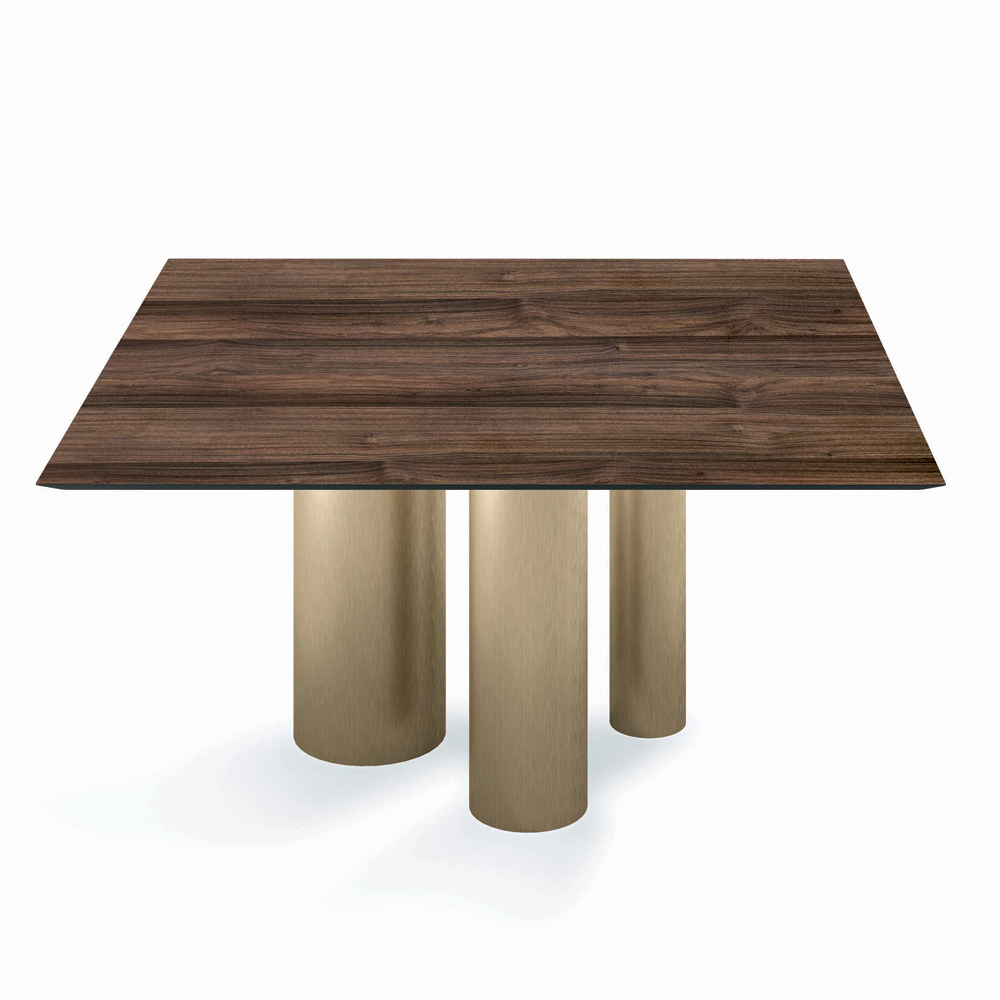 Table de salon fixe carrée avec plateau en stratifié , bord biseauté à 30° , piètement en acier laqué champagne et pieds réglables. L'élément caractéristique de ce produit est la base composée de 3 cylindres de tailles différentes qui lui confèrent une élégance et un raffinement uniques . Cette table peut compléter et personnaliser n'importe quel environnement quotidien et contractuel, répondant au mieux aux besoins de conception les plus divers. Il est entièrement fabriqué en Italie en choisissant des matériaux de première qualité et en prêtant attention à chaque détail.