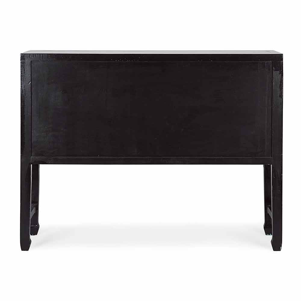 Table console noire en bois d'orme avec 5 tiroirs et 4 portes au design vintage.
