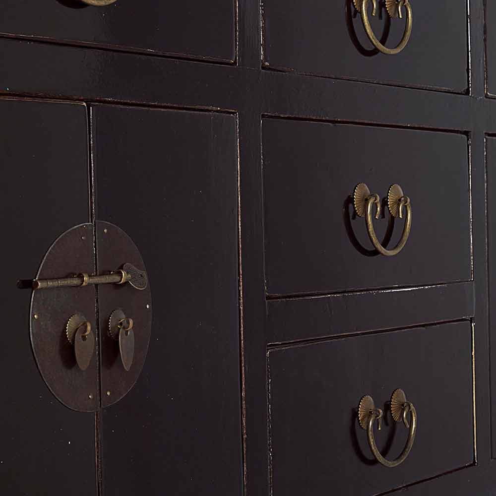 Avec 5 tiroirs et 4 portes pour une compositiongéométrique et régulière, les élégantes poignées en cuivre complètent la scène , créant ainsi un style vintage parfait, capable de donner luxe et élégance à n'importe quel environnement.