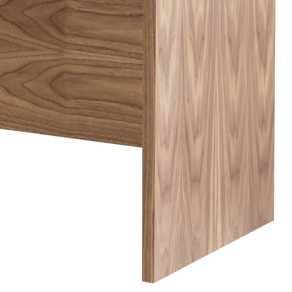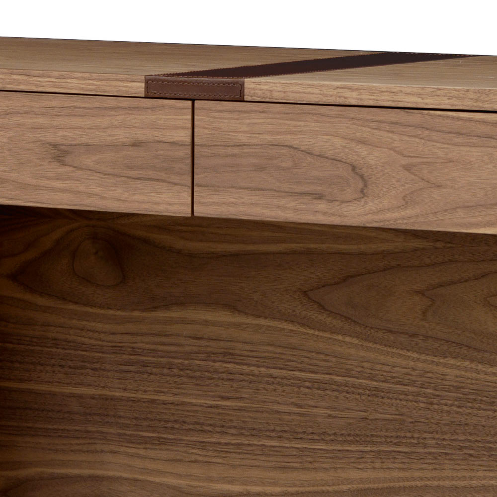 Fabriqué en contreplaqué courbé plaqué en noyer canaletto avec inserts frontaux en cuir naturel. Les tiroirs ont des glissières escamotables avec système de verrouillage silencieux.