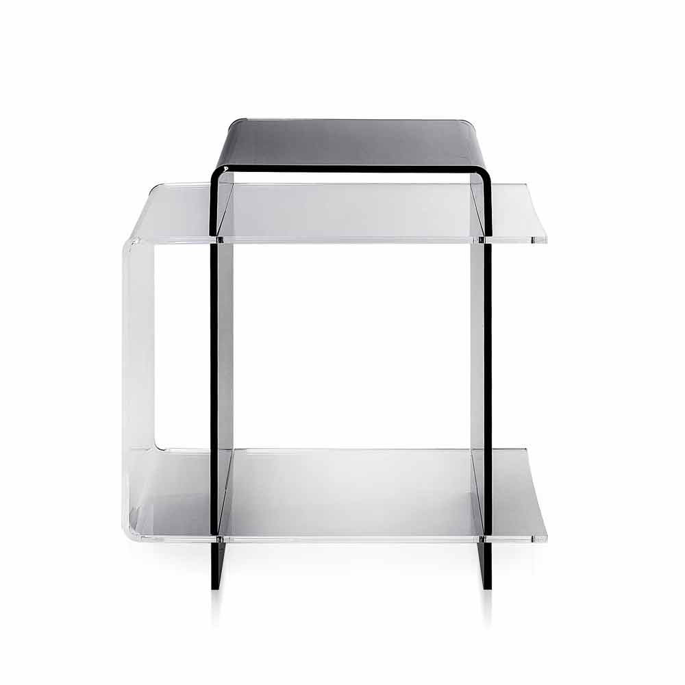 Table d'appoint/table de chevet de couleur fumé à 3 étagères, inspirée des années 70 pour ce qui en est des géométries et des couleurs. Réalisée en plexiglas de polymère 100% vierge, façonnée au laser et modelée à haute température, Gosto dispose d'une structure autoporteuse, assurée par l'épaisseur.