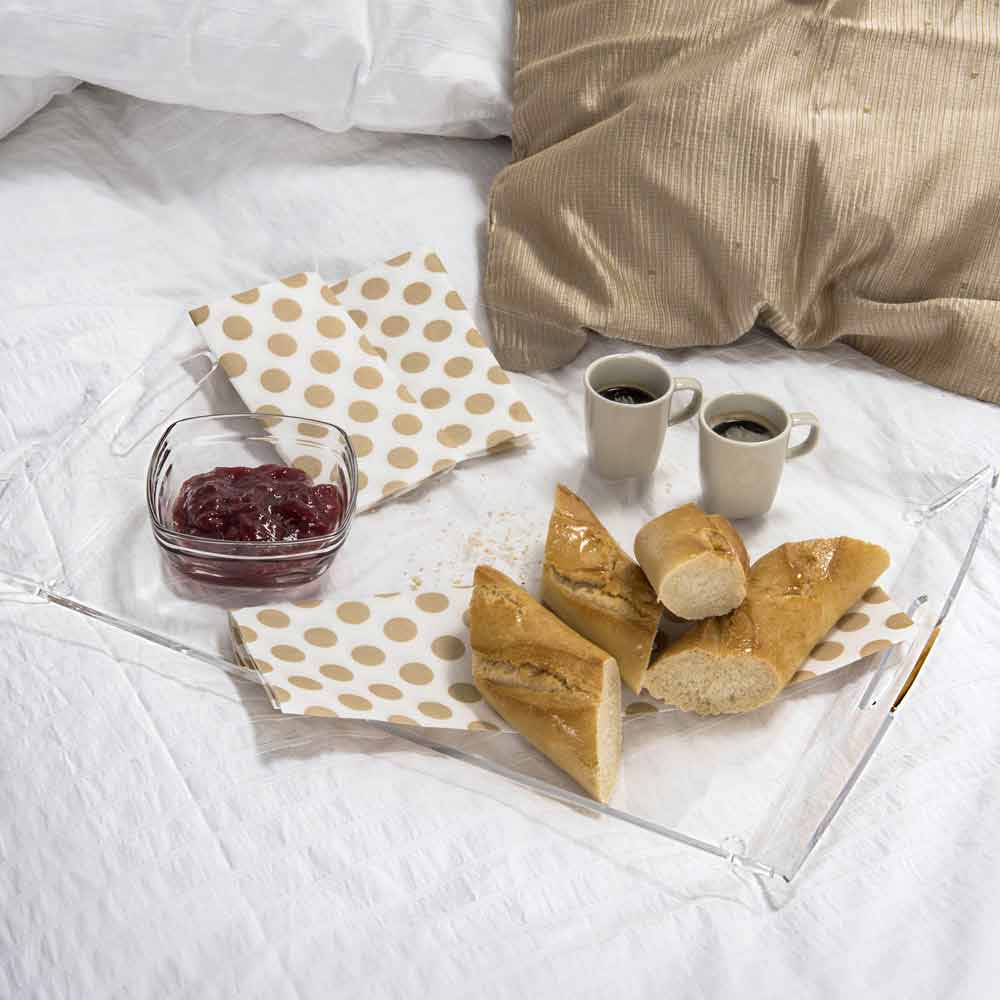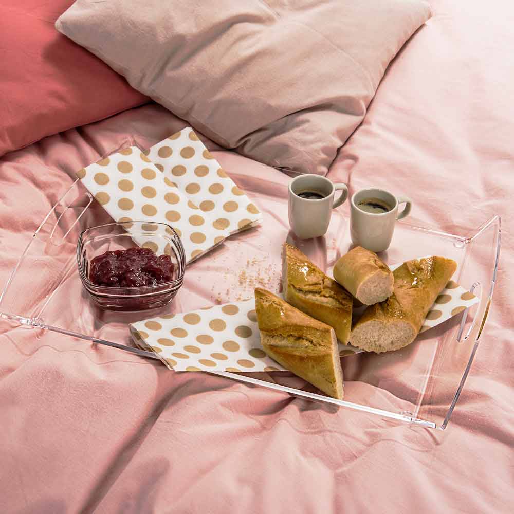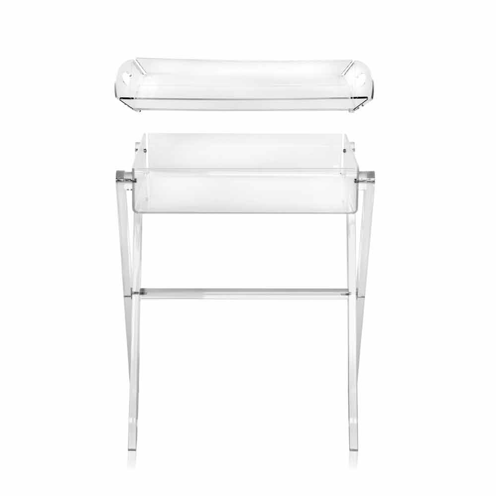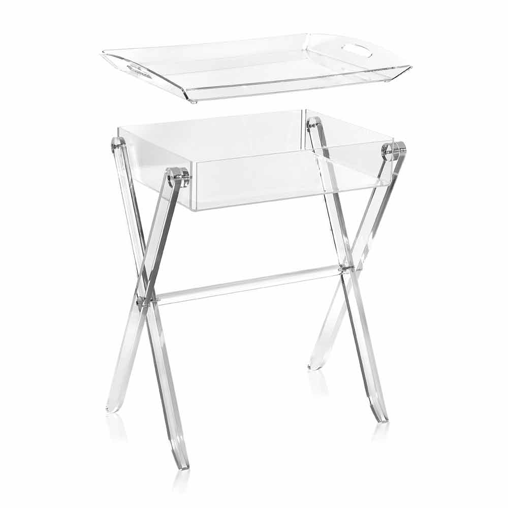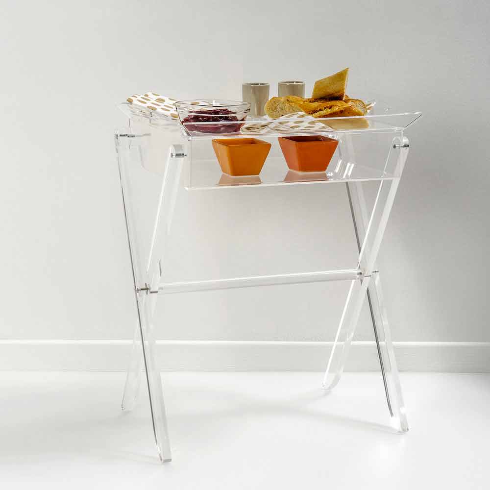 Discrète et élégante à la fois, Olivia est une table d'appoint à nourriture avec deux étagères: l'étagère inférieure pour poser les assiettes, la nourriture ou les journaux et l'étagère supérieure qui peut également être employée comme plateau pour servir le petit-déjeuner au lit, du thé ou du café. Le plateau est entièrement réalisé en plexiglas PMMA transparent de polymère 100% vierge.