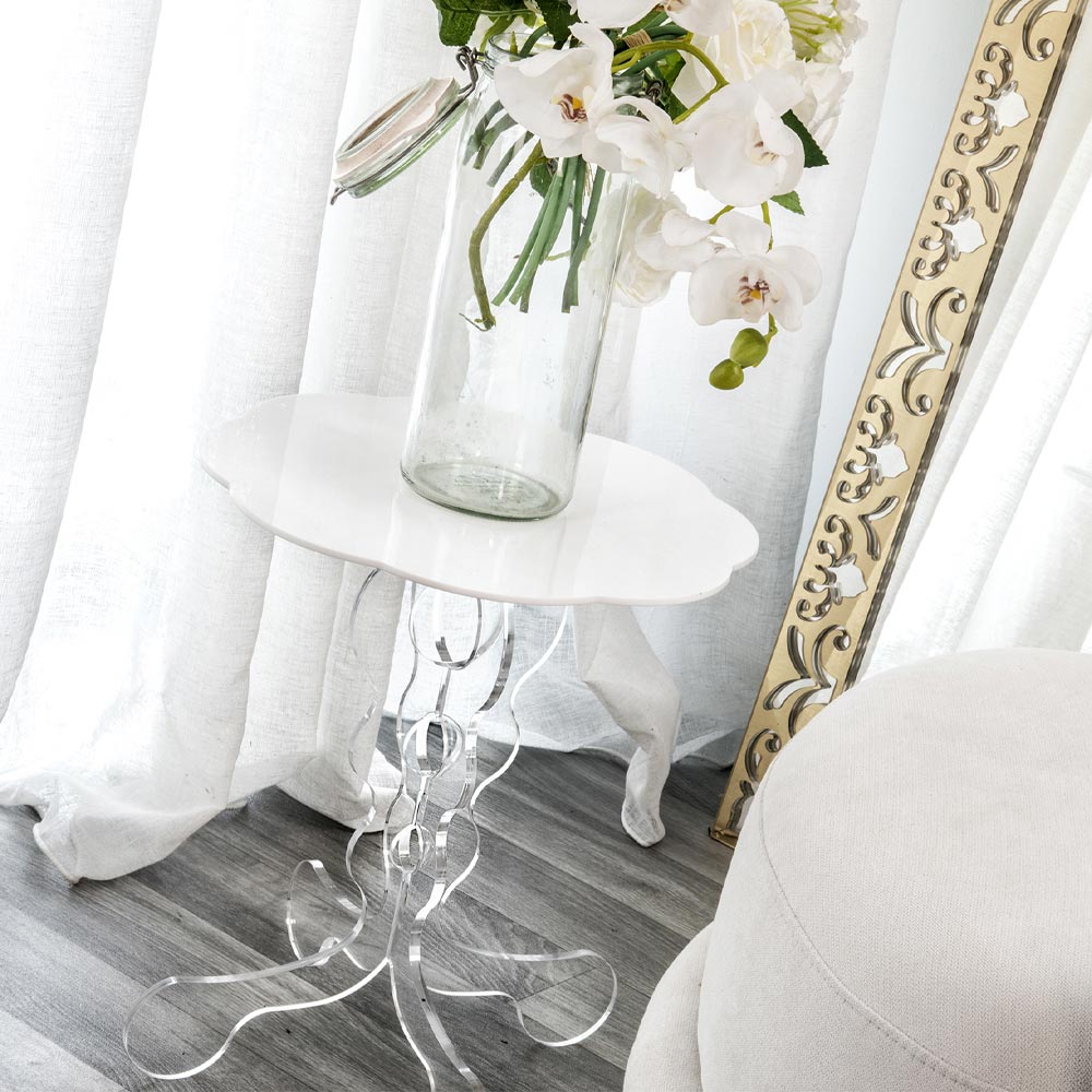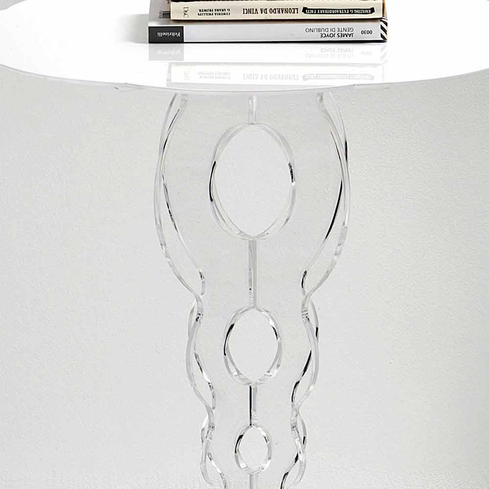 Janis est une table ronde blanche aux motifs mauresques: la base, en plexiglas PMMA transparent, réalisée à partir d'une plaque de polymère 100% vierge, est façonnée au laser et confère une touche de discrétion à la table; le plateau, en revanche, apporte de la couleur à l'ensemble de l'espace domestique.