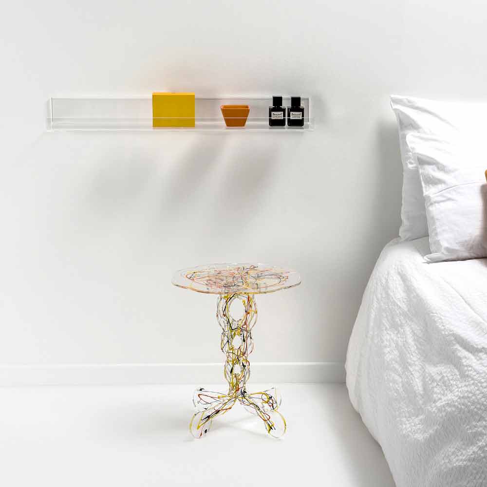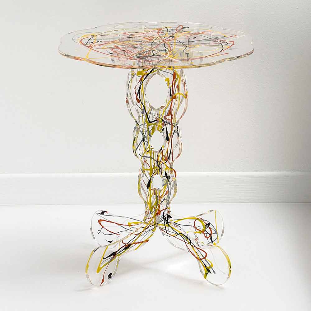 Janis, table ronde excentrique multicolore aux motifs mauresques, peut servir de table à café, de chevet ou pour extérieur. La base en plexiglas transparent façonnée au laser rend cette table discrète, tandis que la pulvérisation artisanale, qui rend hommage à Jackson Pollock, lui confère une touche d'originalité. La base, comme le plateau, est en cristal acrylique PMMA de polymère 100% vierge.