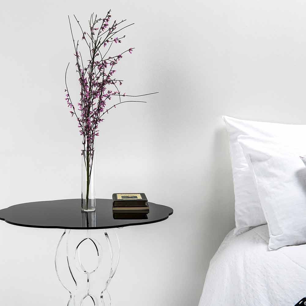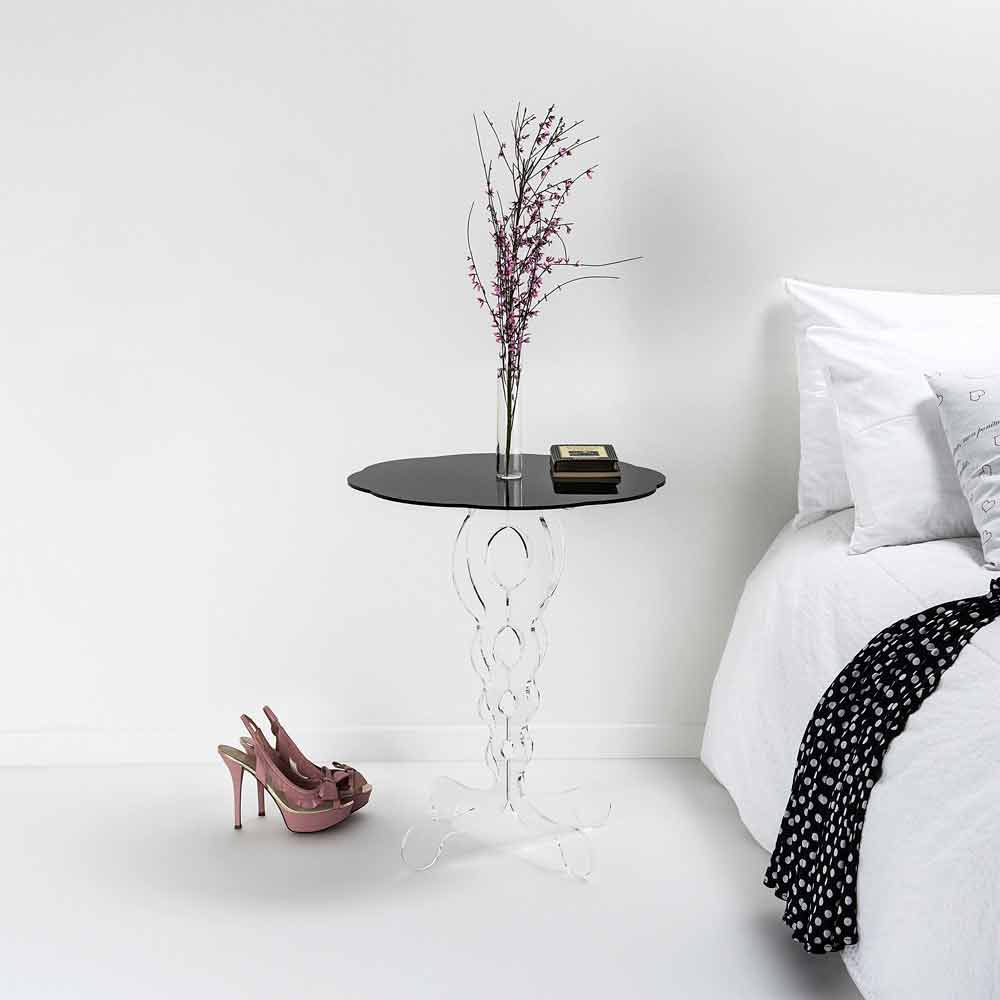 Janis est une table ronde noire aux motifs mauresques: la base, en plexiglas PMMA transparent, réalisée à partir d'une plaque de polymère 100% vierge, est façonnée au laser et confère une touche de discrétion à la table; le plateau, en revanche, apporte de la couleur à l'ensemble de l'espace domestique.