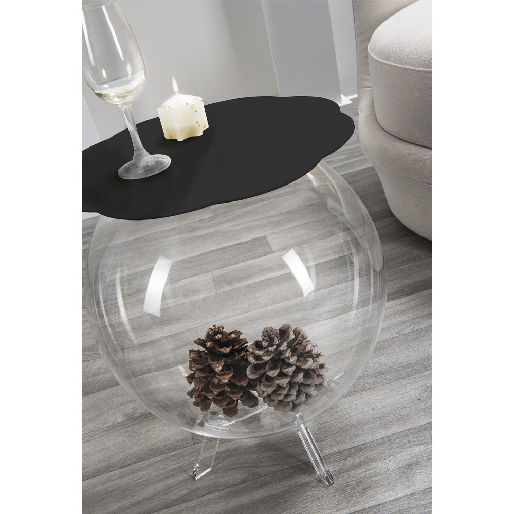 Table d'appoint/de rangement en plexiglas avec structure sphérique qui peut servir de pot pour les fleurs, d'acquarium ou, tout simplement, de boîte pour y ranger les jeux des enfants ou la lingerie. La transparence de Biffy fait de cette table un produit au design discret, facile à placer dans la maison. Le plateau est en plexiglas PMMA noir de polymère 100% vierge.